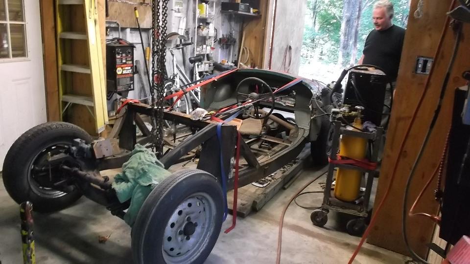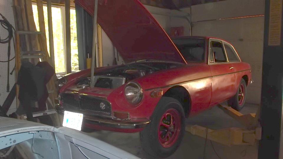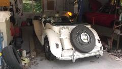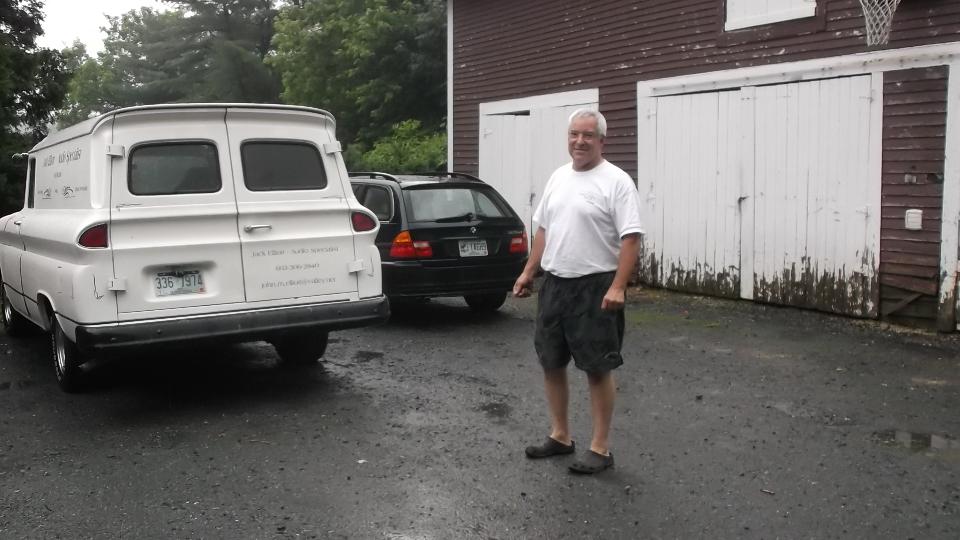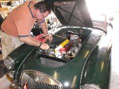 and we got soaked by the time we got the top up. Then the car being wet inside fogged up the windows while heavy rain flooded the roads making driving difficult. So we decided to re-route and headed to I-91 for easier driving. Another hour plus we did ultimately arrive in Lyme to visit Jack Elliot. There was a bit of drying out, and checking to be sure the computer would still work, after which we moved to the "barn" (workshop) to check out his MGA problem.