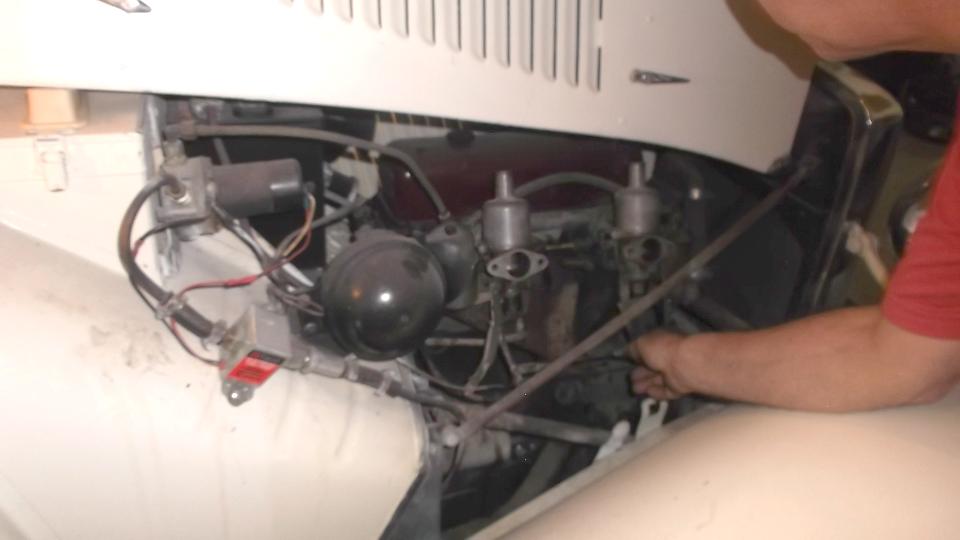 The important appointment for the day was to visit David Cobb in Enfield, CT. His MGA was dying sporadically, then recovering, then dying again. Last report was that it wouldn't start at all. In the end it had a few different problems. First, the choke cable was adjusted too long so it had very little choke action for cold starts which we fixed). Second, the rear choke lever was broken so it could not carry the J-link, so the front choke was not working at all, and subsequently no fast idle function either. When I held the chokes manually it finally started but was running on two cylinders only. The third problem was no fuel in the rear carburetor float chamber, because the Gross Jet was stuck shut. That little gadget had to be removed and molested a few times to clear it out, but finally worked well.