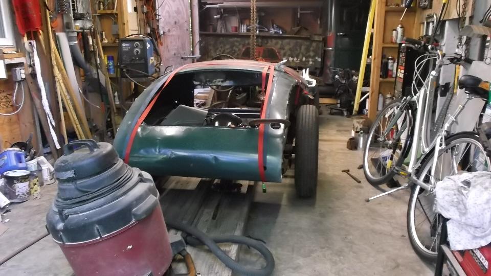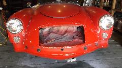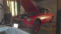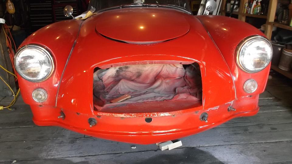 Ta-da! Next morning a bit of sanding and buffing followed by reassembly, and the car is good to go again. Not bad, considering it was done in a barn. There was one overlap spot that had a bit of primer showing after wet sanding (too aggressive), so we masked it off and re-sprayed a small spot in the transition zone. No rush here, so we left the tent in the back yard for one more night.
