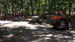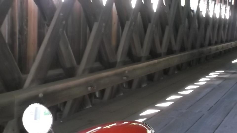 wash clean blow dry, and application red top coat done by mid afternoon. No sense wasting time watching paint dry, so we take the host's MGA for a short covered bridge tour. Upon return a friendly (and nosy) neighbor greets us with an invitation for a short tour of the local lake in his new boat (so why not). Strip masking tape off of the MGA, and do a little artist brush touch up of some chips and scratches about sundown. Lodge reservation expired, so we will drop the tent in host's back yard tonight.