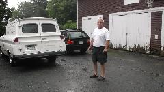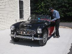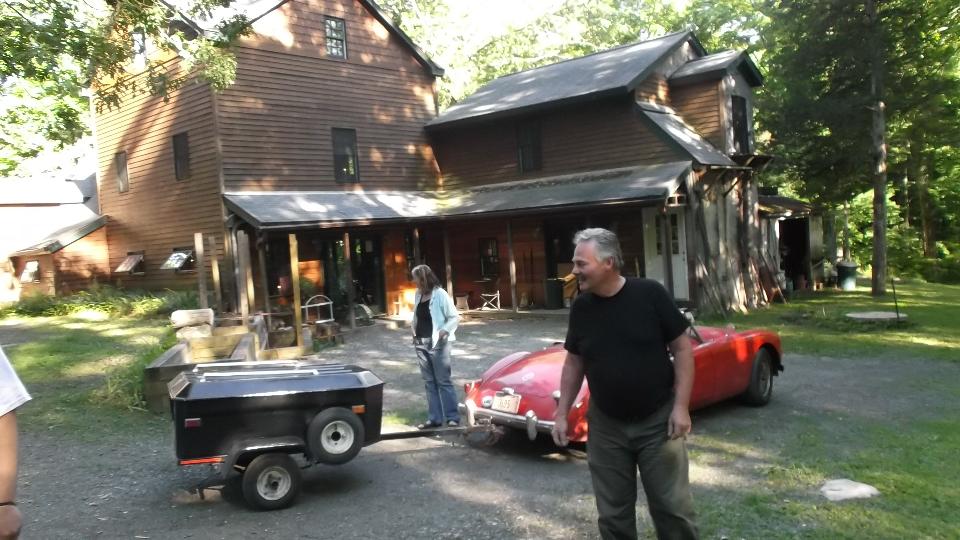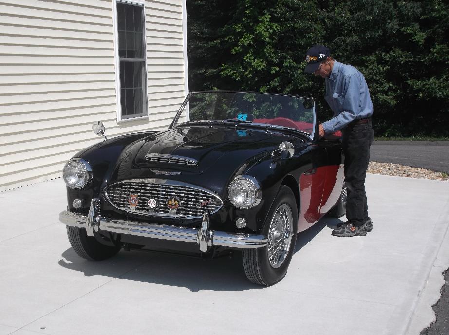 So we travel several miles south to the next large (larger) town, New Milford, where we find a McD's for WiFi connection. Searching the net for "Charlie Lumb +MGA +Connecticut" turns up a classified ad in a club newsletter with his phone number (as navigator nearly falls out of his chair in disbelief). One phone call for the street address puts us on our way again following Mapquest directions. A bridge out makes us detour a few miles, after which we find a narrow gravel road winding between trees in another forest, and we find post box 105 as planned, followed by Charlie Lumb waving and smiling.