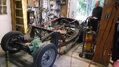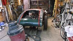 A bit of poking around turns up Charlie's project MGA with a good start but a long way to go. He is in the process of welding a new (used) outer shell onto the rear clip, but is having problems MIG welding old sheet metal with "weld-through zinc based primer. I have done this with new sheet metal, but this old metal is a real trick. After a few tries under my hands we set it aside for having better things to do (like break out the ale). We chat some, then have dinner, then chat some more, and time flies when you're having fun. About 10 pm the group is turning in for the night, but I have some web site work to do for a few more hours before crash and dream.
