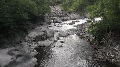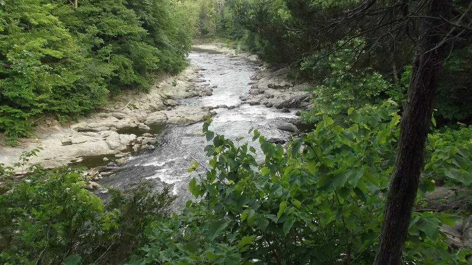 This odd arrangement starts with a short flat bridge over a narrow canal, then a steep drop before entering the covered bridge, and a steep rise on the other side onto a small island, followed by another flat bridge. The canal ducts water down stream to a hydro-electric plant. The "creeks" on either side of the island carry a small amount of water most of the year, but huge torrents of water during the spring snow melt.