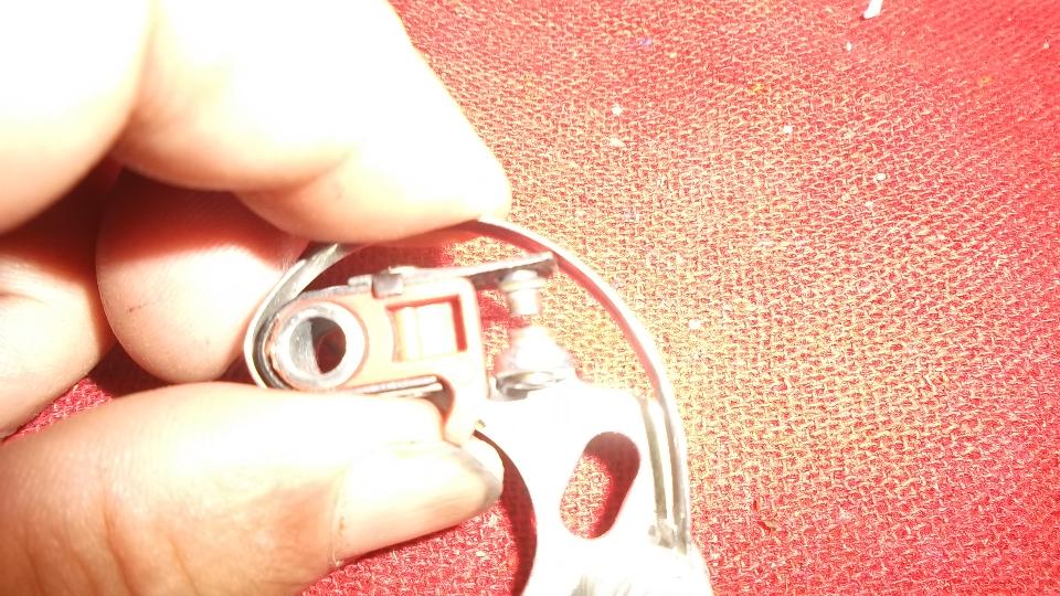 Jim then produces a set of contact points that came out of a freshly rebuilt distributor from Advanced Distributors. The top contact is loose and wobbles around on the moving arm, which was causing the points gap and dwell to change dramatically on the fly. A new set of points cured that problem (resolved before I arrived).
