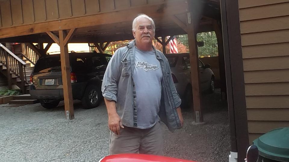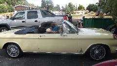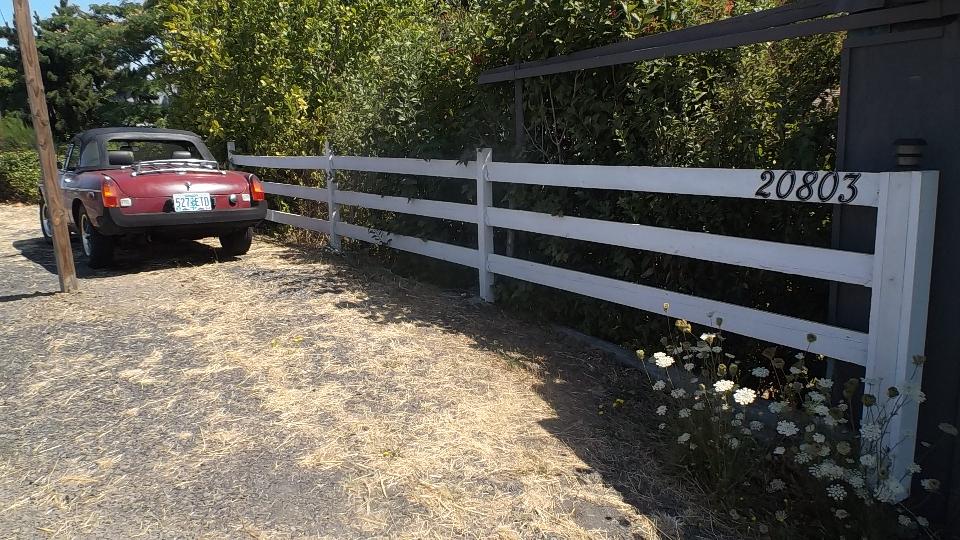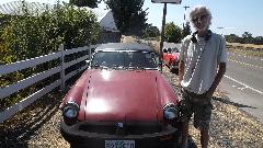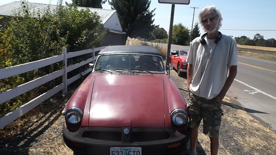 Heading north today, no appointments, not particular rush. So we go 10 miles west from Corvallis on US-20 and then take OR-223 north for 31 miles through Dallas, OR. Then we missed a turn and ended up on OR-99W for 13 miles passing through Amity, OR. The missed turn may have been fortuitous, as when entering Amity we found an MGB parked on the side. Couldn't resist, so we stopped to inquire, and we found this nice gent enjoying life under a shade tree. He has been driving an MGB for many years, lost the last one to an accident and acquired this one a few years ago. Converted from single Z-S carburetor to a Weber downdraft carb, it runs well. His biggest problem is mice liking to nest in the car and chew on the wiring if he parks it in the garage.