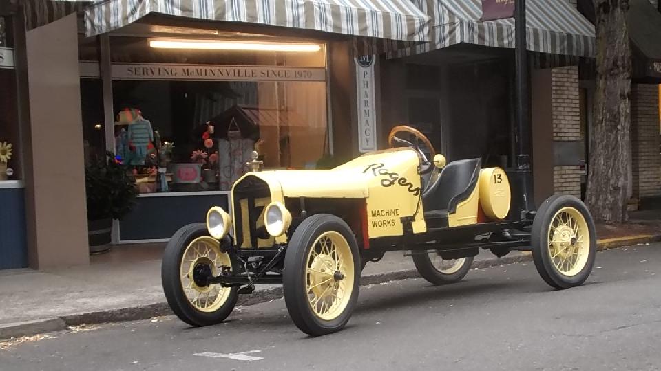 Five days behind in posting the photos and notes here, so I will try to be brief (meaning quick). Today we spotted this little jewel while heading out of McMinnville, Oregon. Looks to me like a Stutz Bearcat stripped down for racing, but I'm probably wrong, and it may be somewhat newer (less aged).