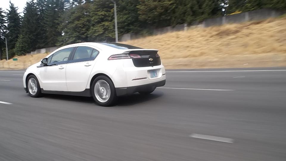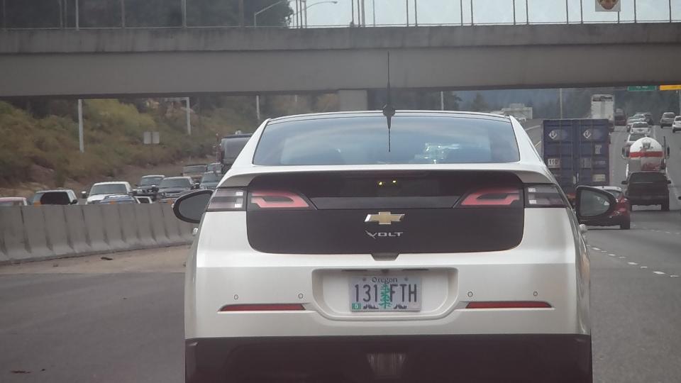We were heading north for next day's appointment and ran upon this Chevy Volt on the expressway. They have a rather short all-electric operating range (about 40 miles), then use an engine generator to extend the range. Not often seen doing long distance on the expressway but perhaps it was close to home.