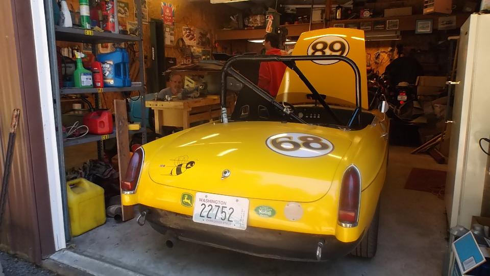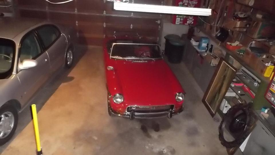 (and yes we were expected this late). I had a chance for a brief "hello" with Pat before she turned in, and an hour (or two) to chat with Kenney before it was appropriate for all of us to crash. I did get one serviceable picture of Kenney's regular driver MGB in the garage, a car with a story (like all good MGs should have). This is a special friend visit, as last time we met these folks we had to crash the gate at Portland International Raceway at midnight in June 1989. Déjà Vu.