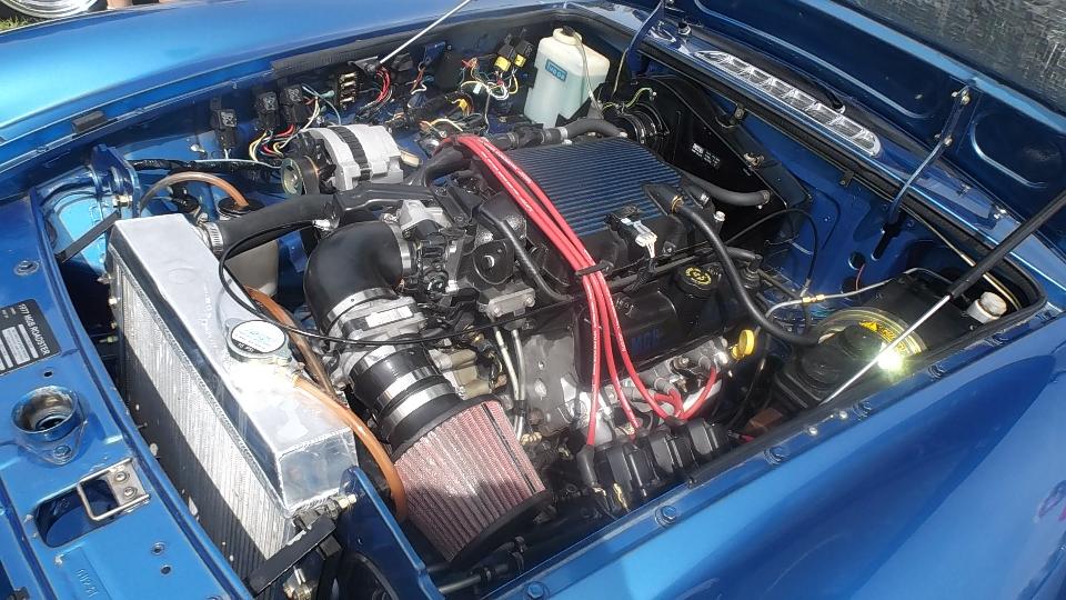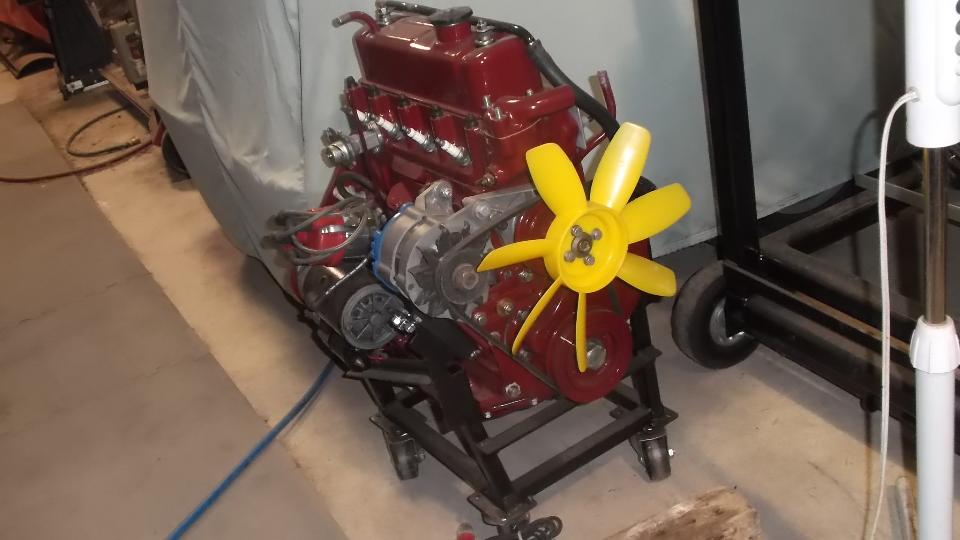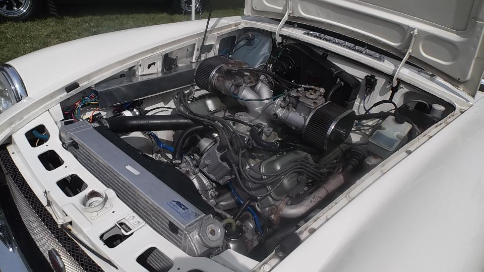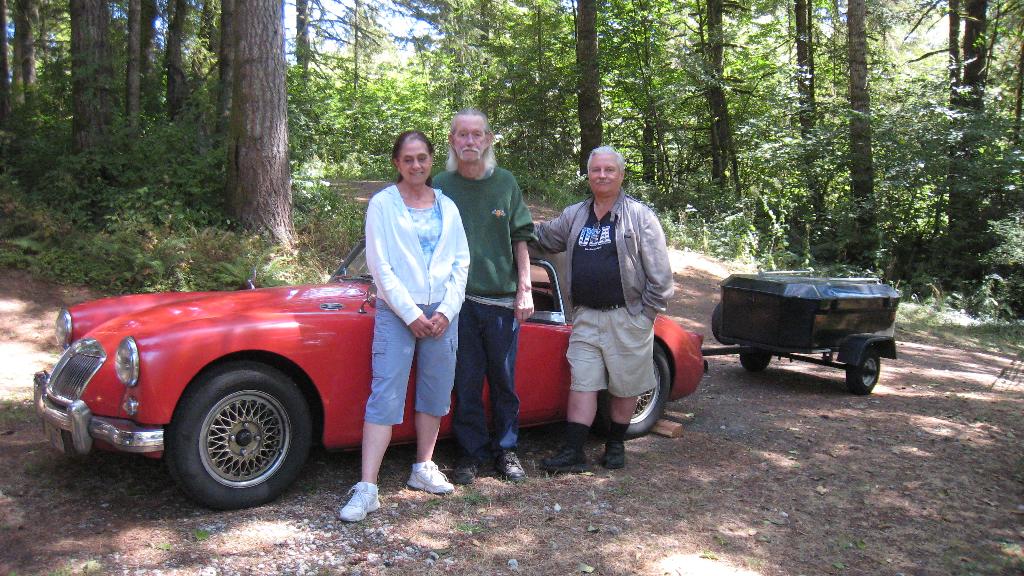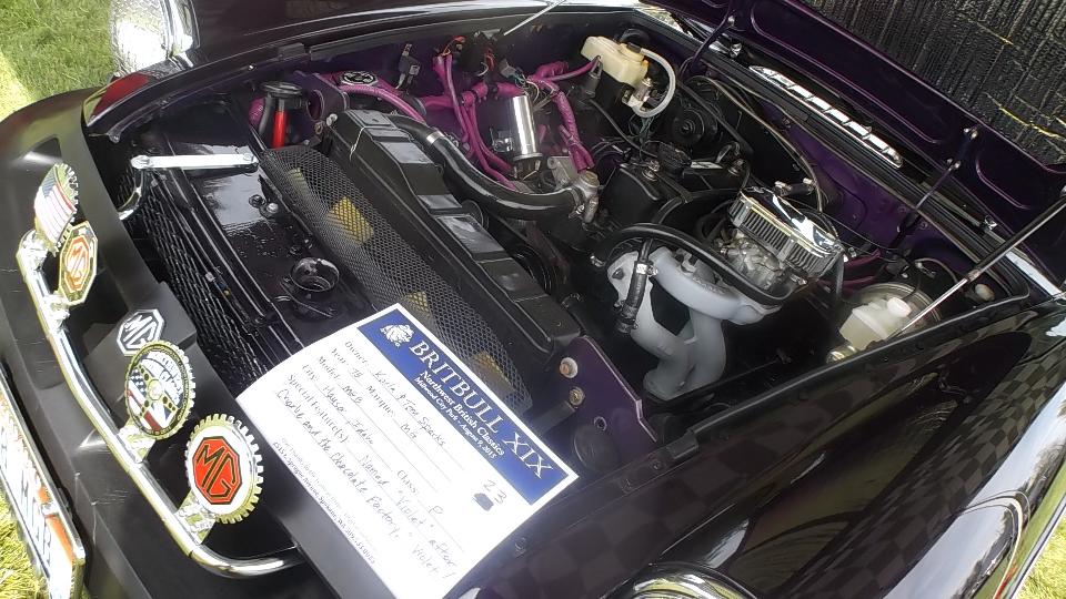 There was a fresh 1800 engine (that will need a shorter water pump and fan blade) for the MGA, and the driver MGB with a fancy paint job on the valve cover. Then finally I have a nice photo with our friends in the light of day. But then we had to bid farewell and run along, having a short run for our next venture.