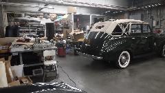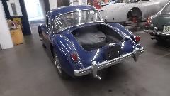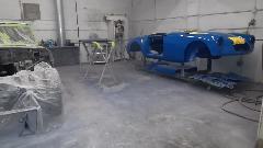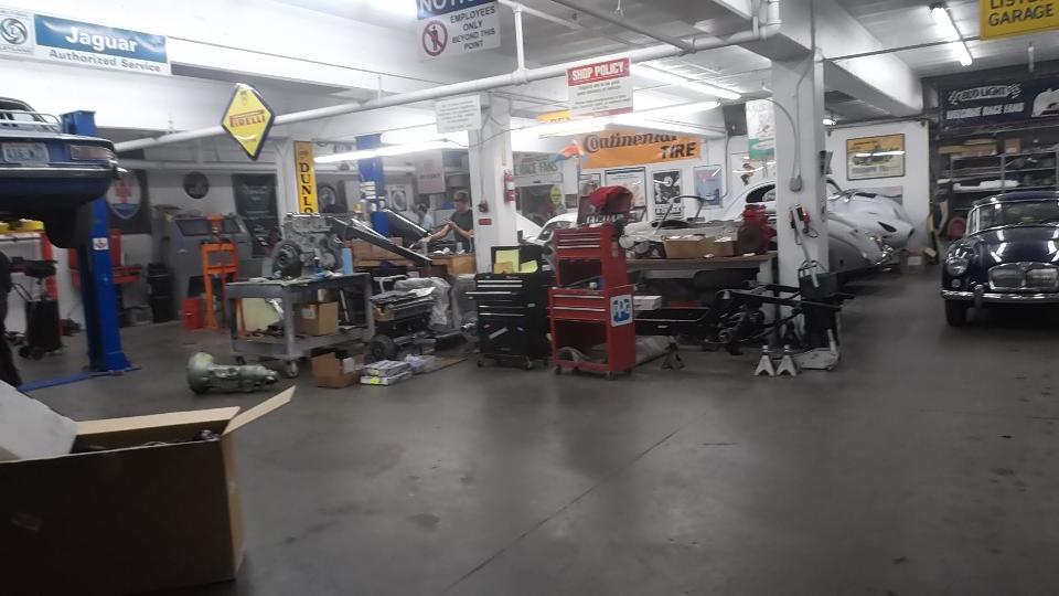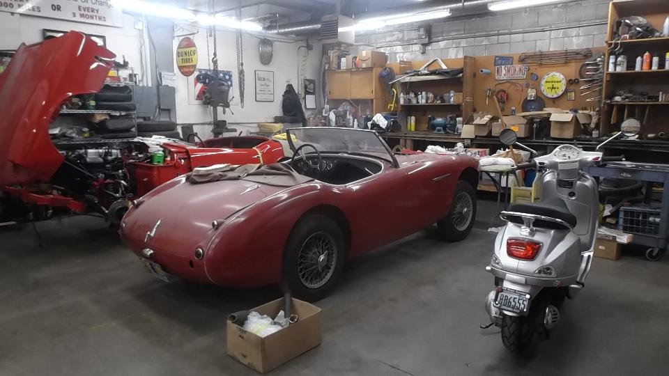 E-type and Twin Cam in paint booth. TR Spit, Big Healey, and a Vespa? That's a Mercury straight Eight.