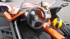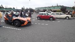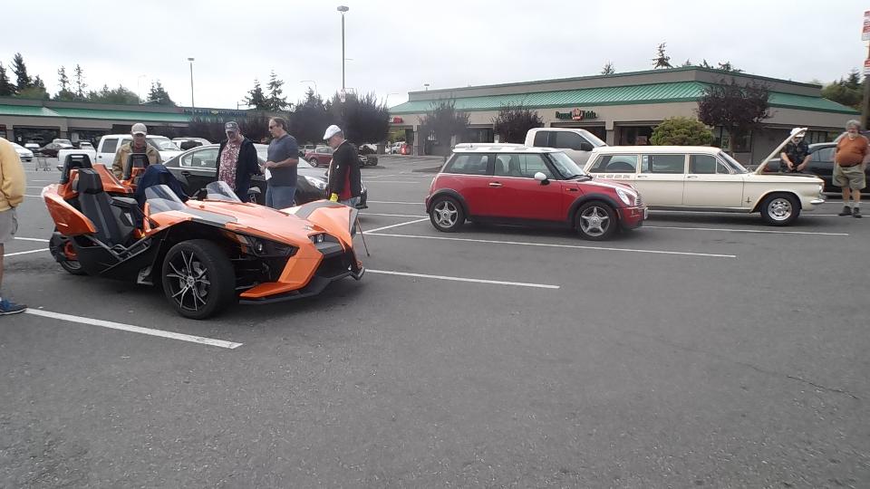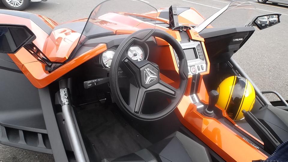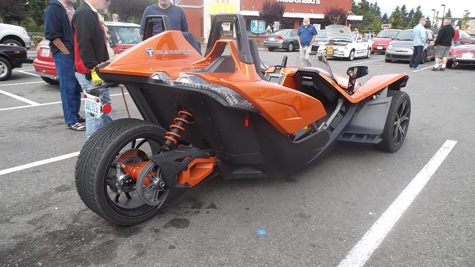 The orange 3-wheeler is a Polaris Slingshot, running a 2.4 Liter DOHC engine and 5-speed gearbox from the Pontiac Solstice. We have a tough time deciding if this is a car or a motorcycle.
