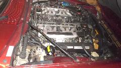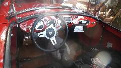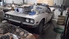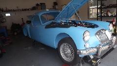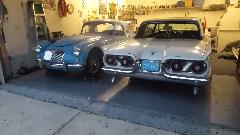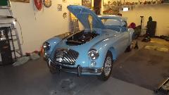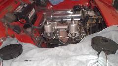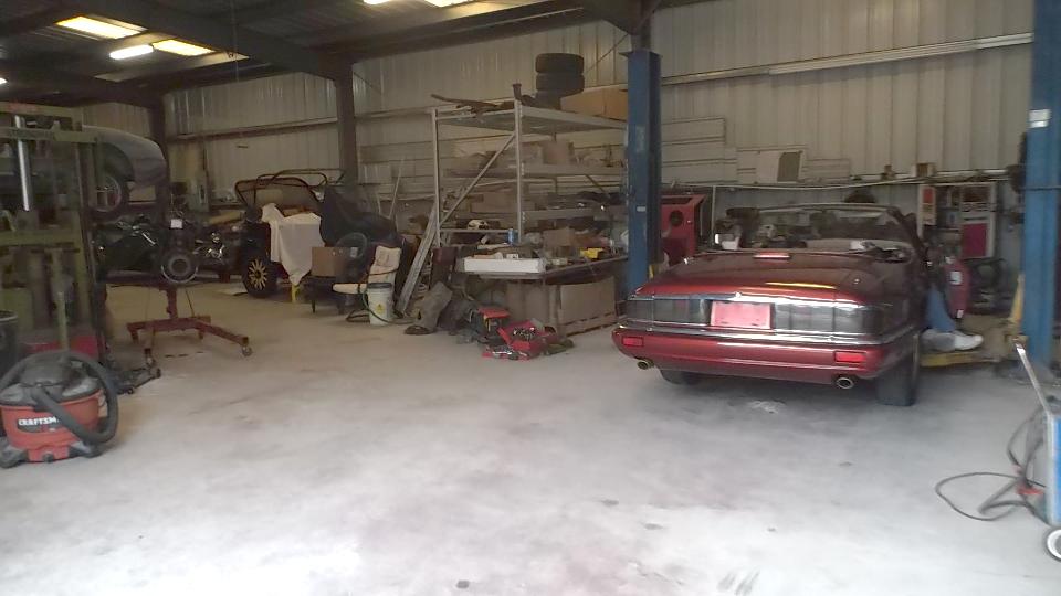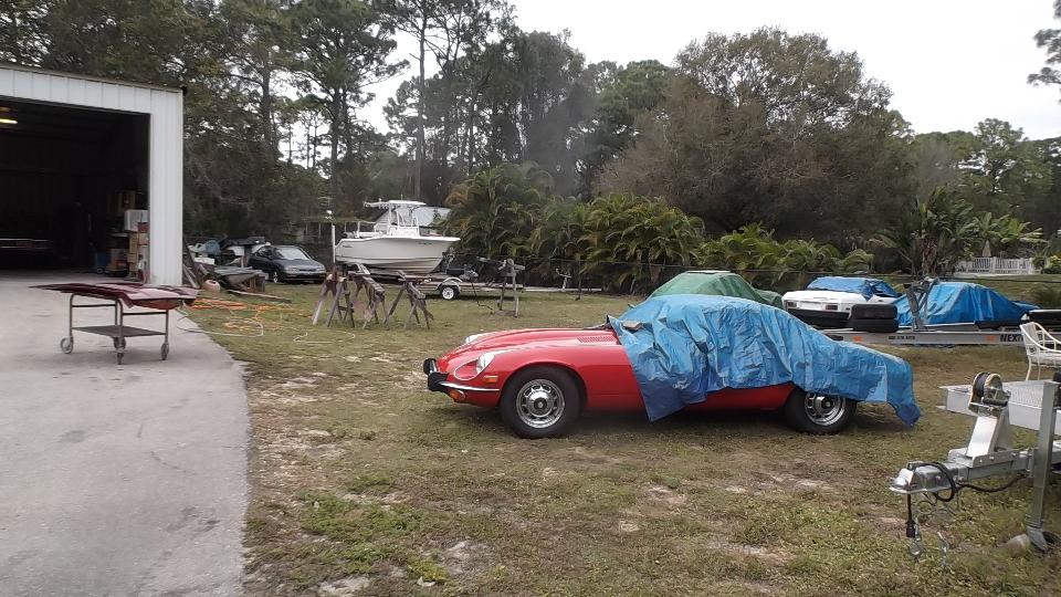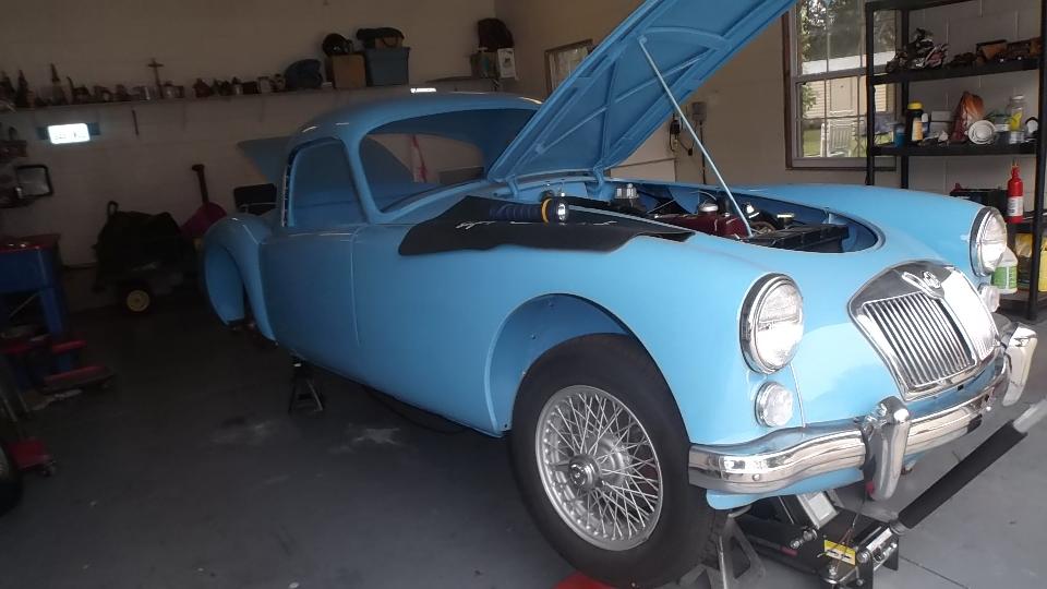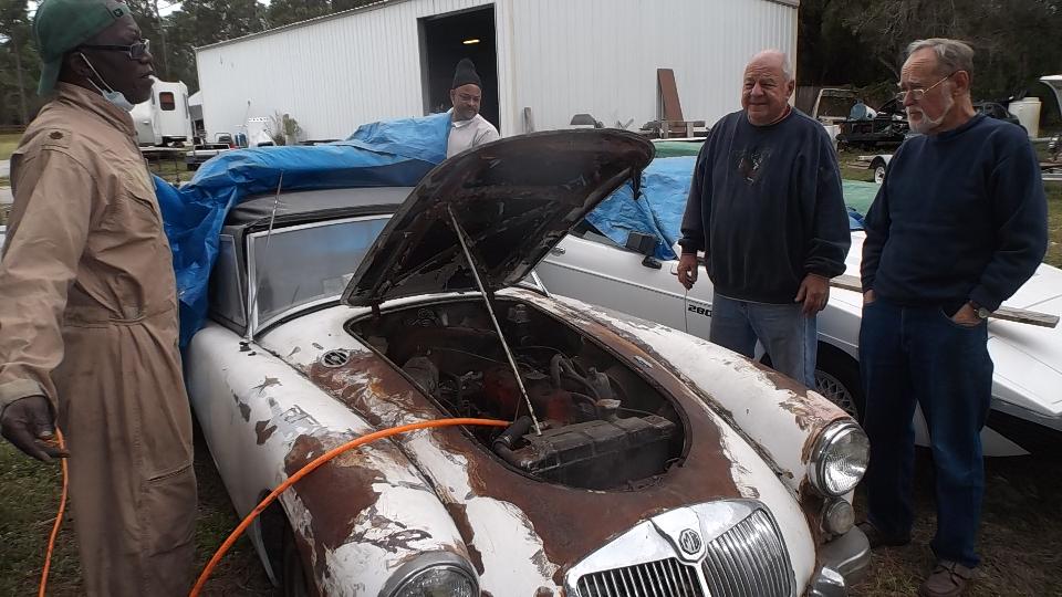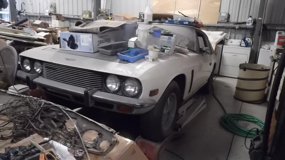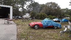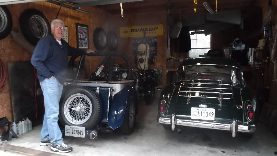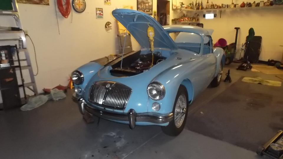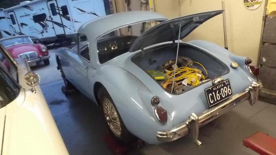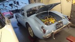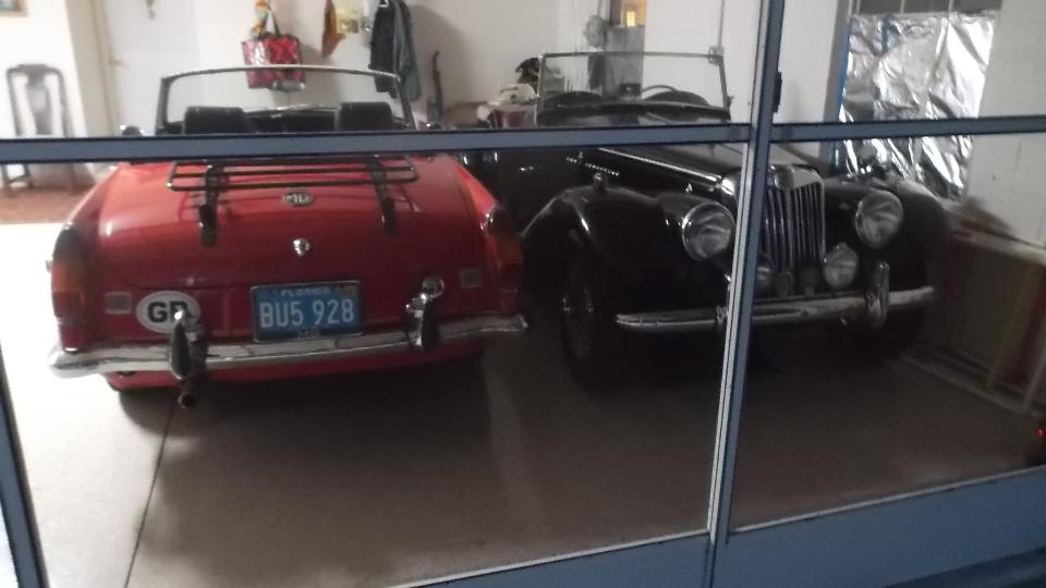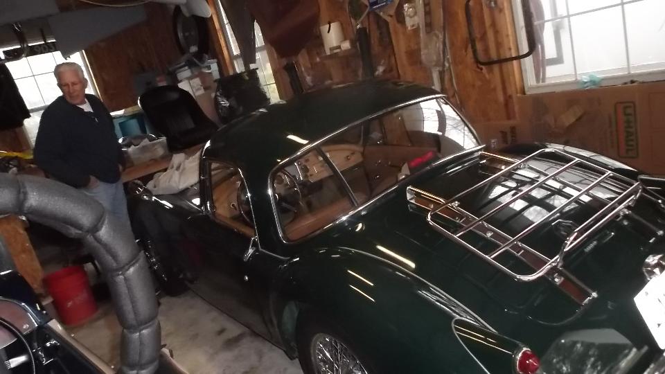 The Jag V12 is newer and fuel injected, looks like almost ready to go home. The white MGA 1600 is somewhat sad with rusty seized engine, but determined to be restored. There is a better 1600 engine indoors.