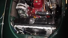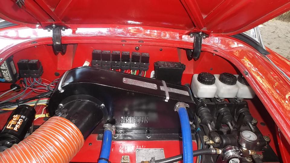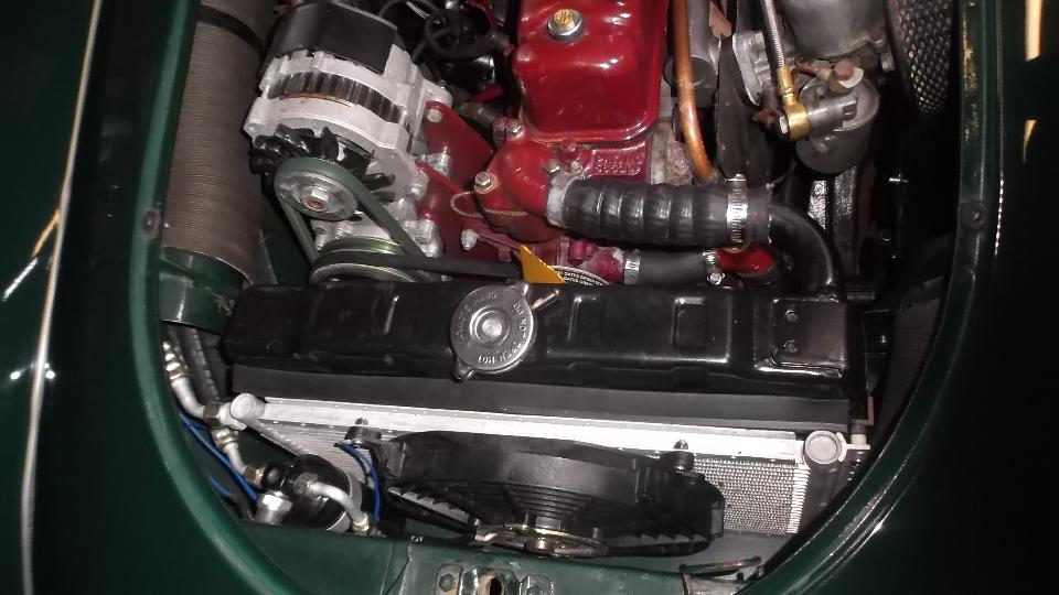 The MGA Coupe has been a pet project for a while. It has air conditioning, a "high capacity" radiator, and electric fan. It had overheating issues for a long time before he discovered the ignition timing was severely retarded. With proper timing it runs much better, but hasn't had a good hot weather workout yet. It also has inner fender louvered panels (ala MGA Twin Cam), which he says drops the coolant temperature about 10dF. Also note the home-brewed wire mesh grill.