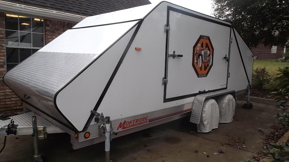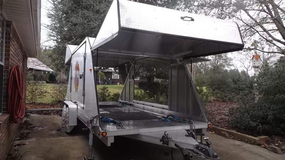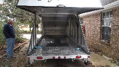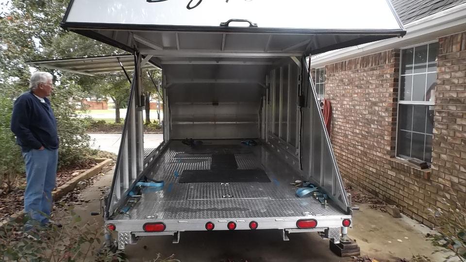 Gene also has this very nice all aluminum box trailer built by Montrose Trailers. It has 18-foot bed and opening hatches on four sides (easy access to tie-downs and car doors), and it weighs only 1800-pounds empty. This will be the subject of another article in the Trailers section of my web site. It leaks a bit around the top of the front hatch door, but that should be fixable.