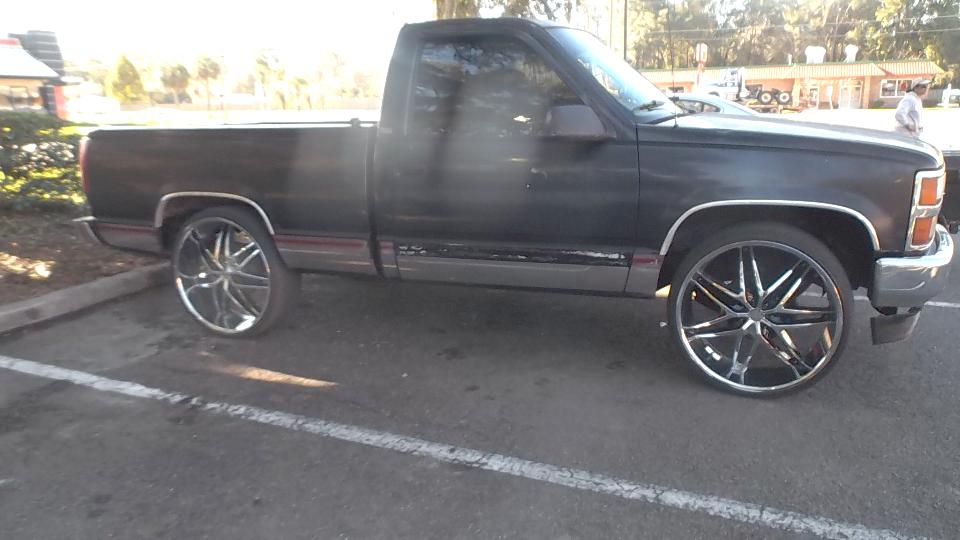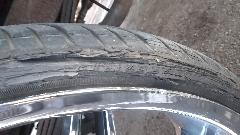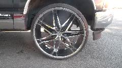A strange way to start the day, parked along side of this thing. I was always curious about such "Conestoga" wagon wheels placed on modern cars. The tires are 275-25-26 (considering that semi trucks use 22-inch wheels). Left rear has a nasty case of sidewall rash and slightly chewed up wheel. The owner says they were on someone's car but rubbed the fenders, so he got them cheap but has to replace the one chewed tire. Likely $1000 each for the wheels, and if you hit a pothole you likely break the wheel. Not for me, thank you,