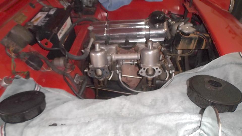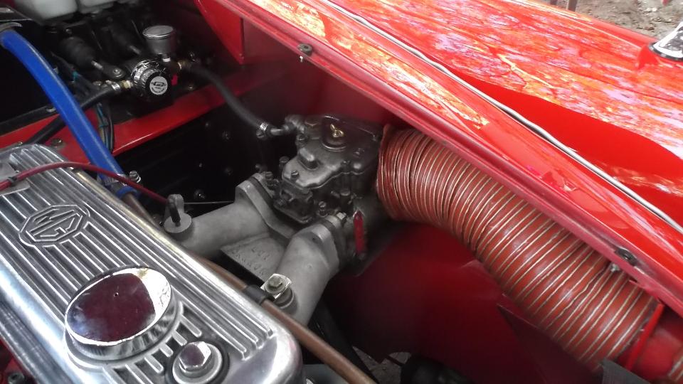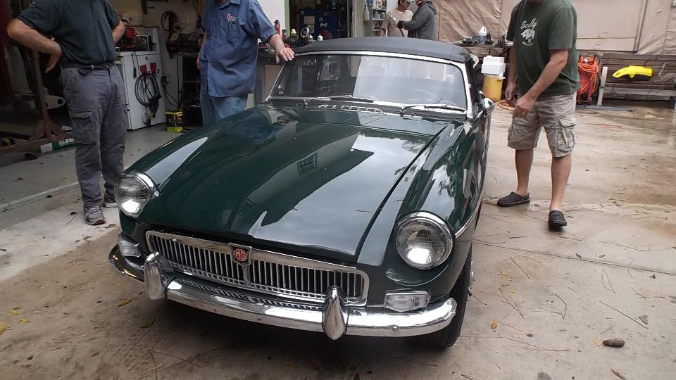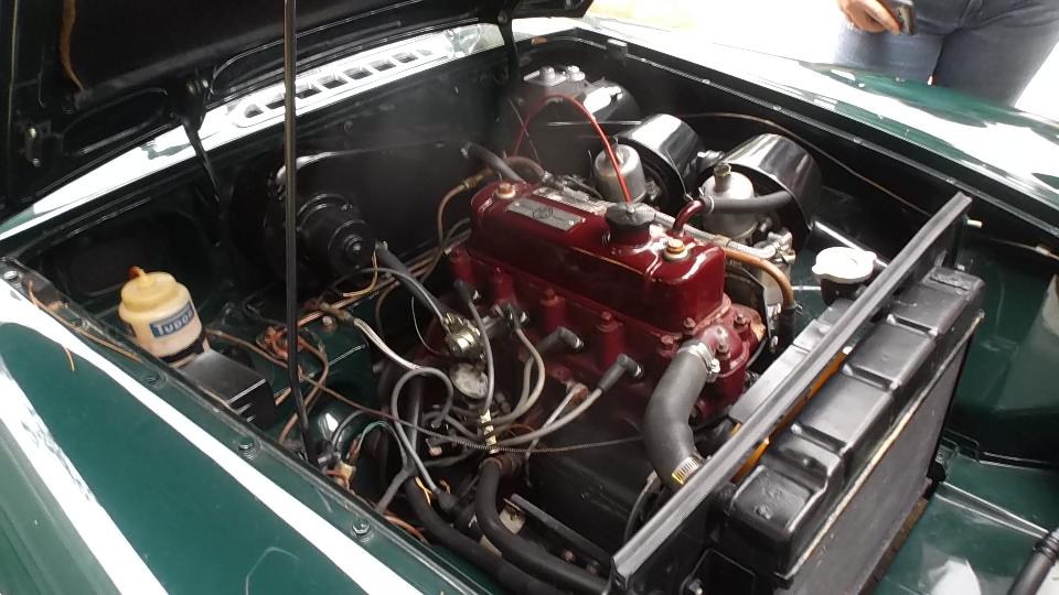 I believe there were three BRG MGBs here today. This one wasn't running (at least not well), had a new Weber down draft carburetor. Didn't want to start in spite of choking and pedaling. Once it was running it was balky with sudden open throttle. I thought maybe the accelerator pump was not working, but sure enough it was. Next guess was very low fuel level in the float chamber. I don't recall the solution (as I got busy with something else), but I think it went home under its own power.