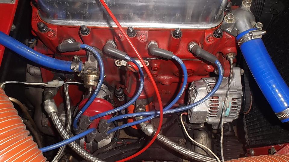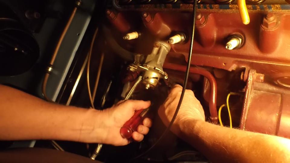 This MGB gave us conniption fits for a while. It was running recently, then just quit. Plenty of fuel flow, power to the coil, points open and close making a test light flash,correct resistance in primary and secondary windings, but no spark from the coil. This implies bad condenser, so we installed a new condenser. Couldn't get the distributor out, so had to fit the new part in situ. Also had to file the hole in the condenser wire terminal to fit (faulty new part). That should have been the end of it, but still no spark from the coil. Grrrr. It was taunting us with an intermittent fire on one cylinder, but no go. Tried a replacement coil with no improvement.