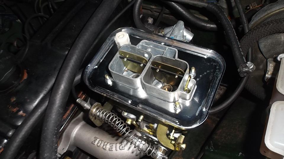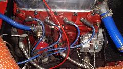 preventing full choke, but I pulled full choke at the carb linkage, and it still wouldn't start. Most of the plugs were black but dry, so I didn't think that was a problem. Removed air cleaners and shot some WD40 down the throats, but still no fire. This might be stale fuel, but the fuel was marine fuel with no alcohol only 90 days old. Off to buy a can of starting fluid, and Lee opted for a new set of spark plugs. New plugs installed full choke, but no fire. Starting fluid got it running for a bit, then it quit and would not restart. More starting fluid had it running again, after which we kept it running long enough to warm up, after which it idles well and does not re-tuning.
