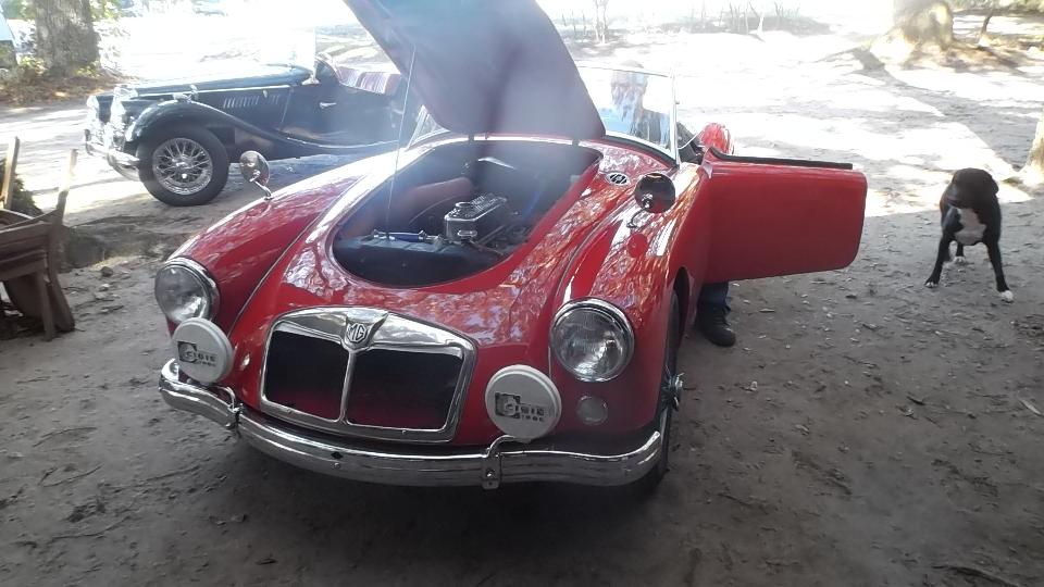 There are at least a dozen of these little Florida Sports Cars in the car park, buzzing around here all the time. They are light weight 2-seater roadsters like my MGA, convertible top, side curtains, boot in the back. Good thing they can be double parked, as there are no parking spaces left here. Lots of these people know about MGAs and stop to chat.