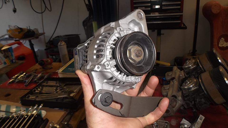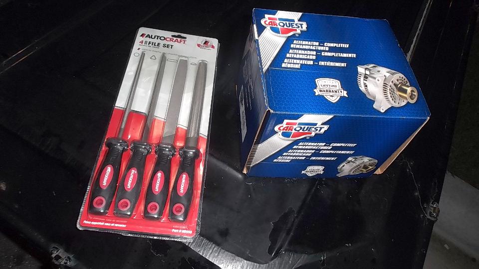 Friend arrived, began jump to recharge battery, made a few phone calls to find a new alternator. Drove (friend's car) several miles to buy new alternator, and bought a set of hand files at the same time. Now the real problem. I should have and would have installed a Lucas alternator (or a Bosh equivalent part), but those are not easy to find locally on short notice. So I bought another Mitsubishi alternator, which had to be modified similar to the old one. The hand files were employed (for nearly an hour) to remove 1/8-inch of aluminum from the rear side of the mounting ear where it attaches to the water pump (for alignment of the drive belt). (That was a lot easier the first time in the home garage with power grinder). Then run a 5/16-24-UNF tap though the adjustment ear to accept the UNF bolt that was already on the car (with a previous Heli-Coil), because the Mitsubishi alternator is metric (and fortunate that I had the tap with my traveling tools). Then just reassemble it, and we were back on the road again. All quite simple, but a royal PITA due to the misfit alternator.