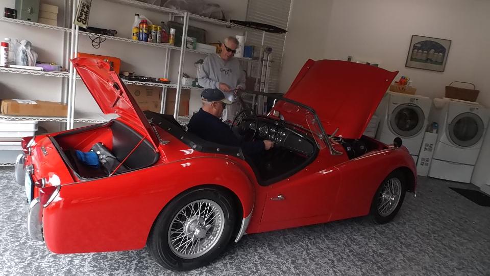 Today we had an appointment with Lee Longstreth in Fort Myers who has a very nice Triumph TR3. The call was for electrical problems with turn signals and horn, but on arrival it wouldn't start. It had spark on all four plugs, and fuel in the carburetors. The choke cable was binding,