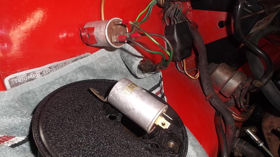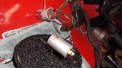 Trip to the parts store to pick up another condenser. Test before install this time. Clamp the condenser to engine mount with vice-Grip, and connect it to the coil with a jumper wire. Car started and ran. Disconnected the jumper wire, and engine died. Repeat again with same results. Proof the new condenser we just installed in the distributor was duff. Double faulty new part. Pain to install another condenser in situ, but that got the car running to go home under its own power. NEVER trust a new condenser.