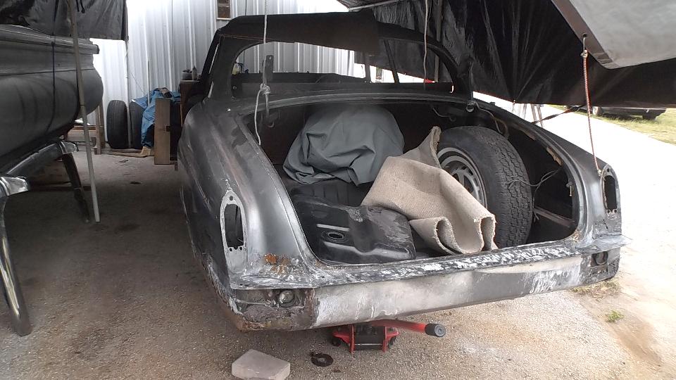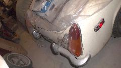 The is a AH Bugeye Sprite in primer, looks like ready for final paint. A Jensen Interceptor, a split bumper MGB half buried, and a Porsche 356 fully buried (no picture). (If I don't show the pictures of cars behind the building I don't have to explain those).