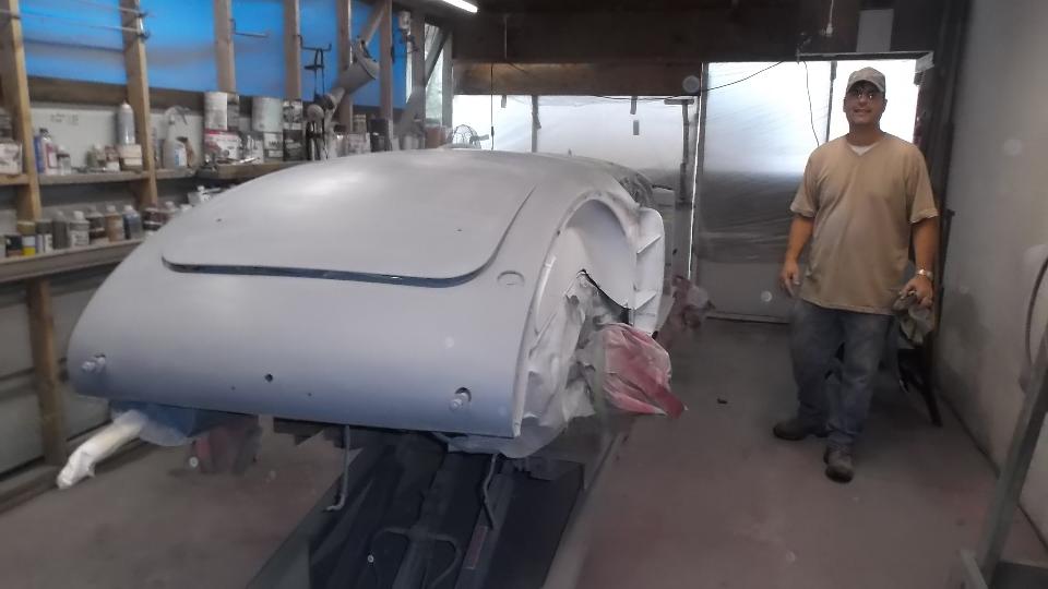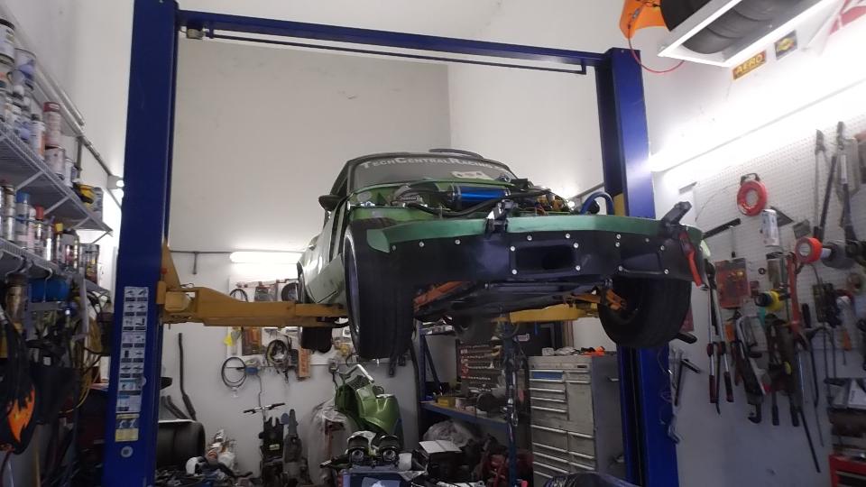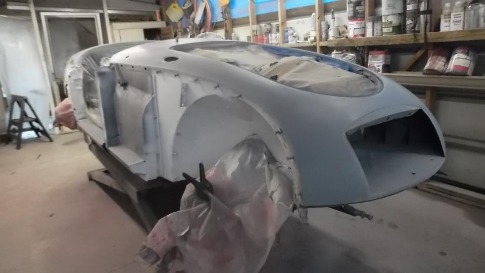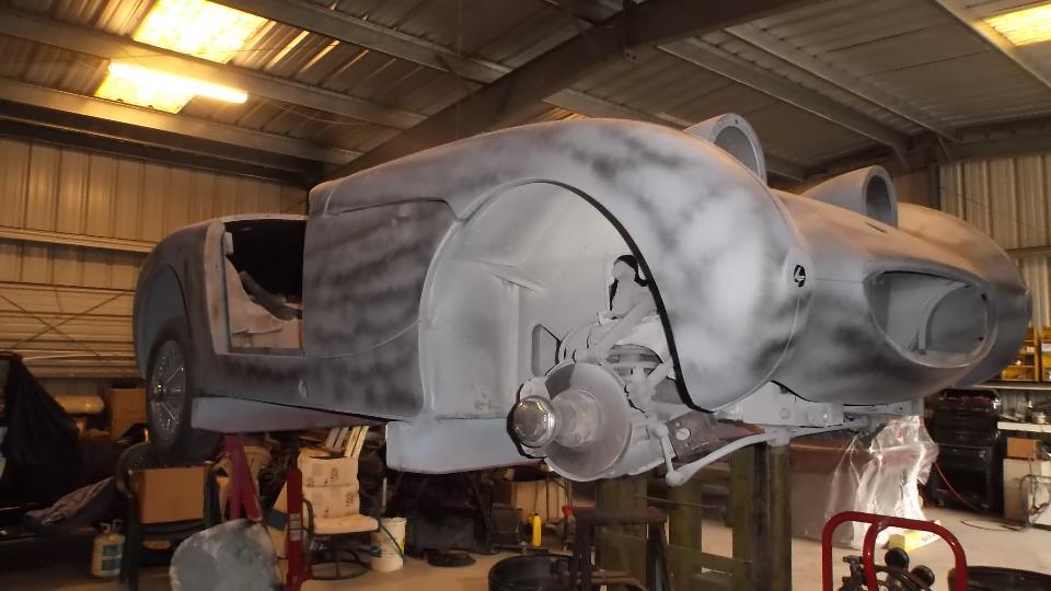 Car on a spit, car on a lift, car in the paint shop (being painted today in spite of intermittent rain).
