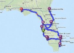 Slept in (the key ingredient of the day). Drove a bit more south to Bradenton, FL (half down the west coast) another 90 miles. By this time no ignition light, battery open circuit is 12.6 volts (so stop worrying about the alternator). More email to the last remaining un-contacted clubs in Florida. We got lucky and finally got a connection with the MG Classics of Jacksonville, a club we hadn't been able to contact in the past. Now the next 2-1/2 weeks (1500+ miles) looks a lot like the trace at right (subject to change of course).
