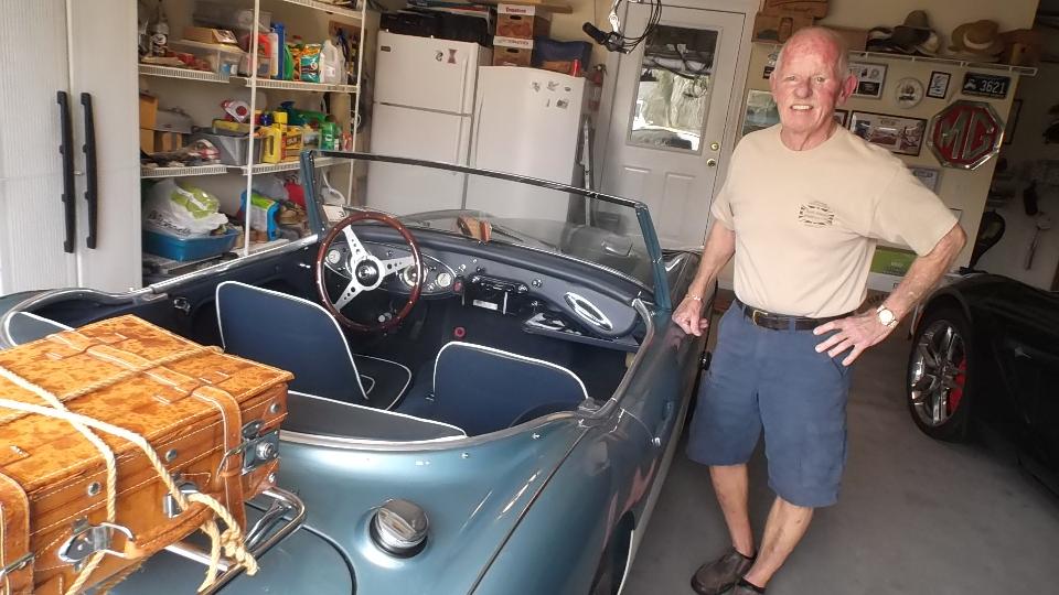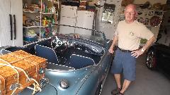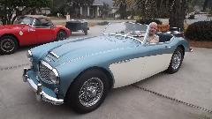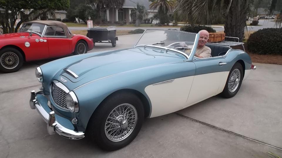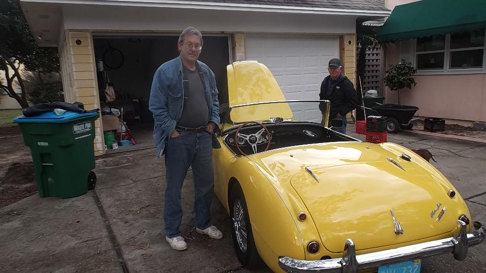 Today we were off to see Gary Finster in Panama City Beach, FL. His first problem was a 1961 AH 3000 BN7 that wouldn't start without a shot of starting fluid (it had fresh gas), and got terrible gas mileage when driving. No start from cold is usually insufficient fuel, commonly not enough choke due to maladjusted choke linkage. True here as well, as the choke cable was sticking so it couldn't be pulled out far enough. With some manual help at both ends of the cable we got it pulled out for full choke, and the engine started on first crank. Note to Gary, clean and oil the choke cable or buy a new one. As to the poor fuel economy, we found a cracked fuel hose spraying fuel like a lawn sprinkler. It appeared to be original factory issue 55 year old hose. We spent some time with a Dremel grinder to cut off the steel crimp shells and save the end fittings. Then a lunch break and a run to the parts store for new hose and a fuel filter, and installed new hose with screw clamps to get the car back in service.