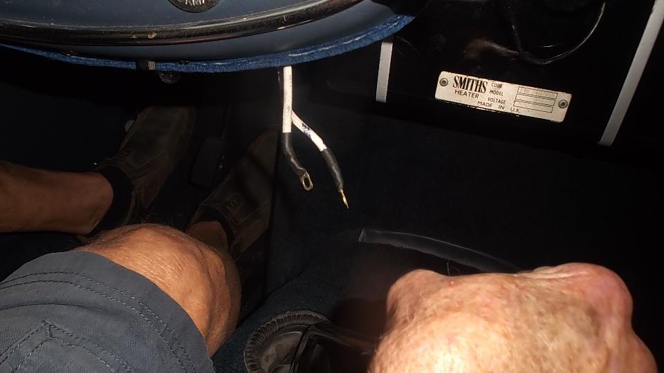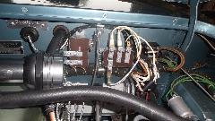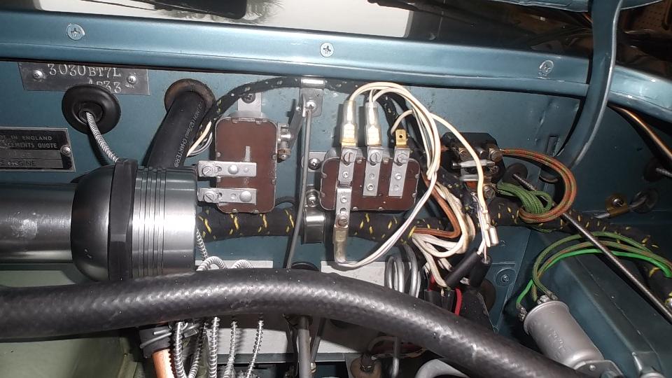 Today we did some work on Charlie's big Healey BT7. First business was overdrive not working. Center picture right to left is fuse box, OD relay, and OD kick down switch (and a flashlight). After a quick check of the wiring diagram and a bit of poking around with a test light, there were two immediate problems. No power to the white wires in the OD circuit, and no ground wire for the relay winding (switching coil). This must be two errors in new OD sub-harness, missing a black wire and having a Lucar terminal on a white wire that should have a bare end. The white wire with Lucar terminal dangling on the right side needed to be clipped and stripped to have a bare end to connect to the fuse block. And we had to make a short black wire with one Lucar end and one fork end to ground under a mounting screw. With all that sorted out we soon found a dead panel switch (no internal contact), which we removed so we coud touch the wire ends together to make the switch connection. We then verified that the 3-4 gear switch was working so the OD solenoid would click on when shifted into 3rd or 4th gear.