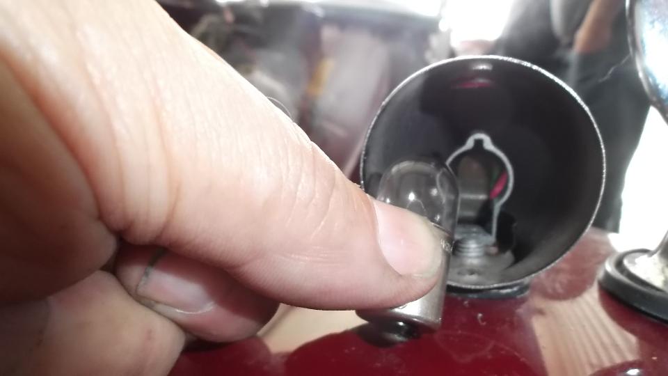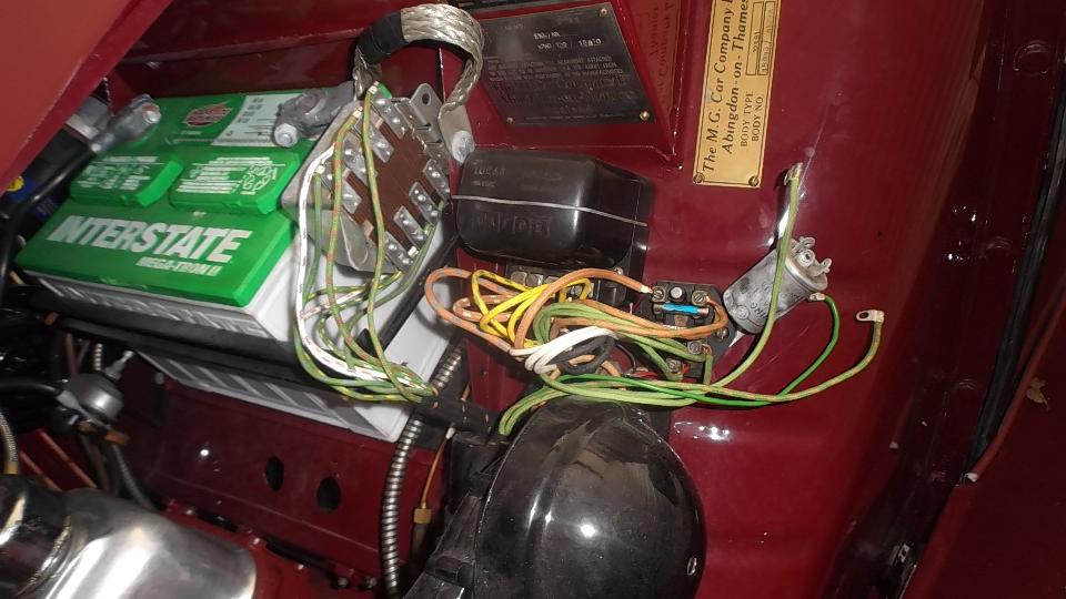 The next patient was Gary's 1952 MG TD. This car has a new wiring harness and a double relay box intended to make turn signals work, but so far it can only make flashing on four corners at once. The relay box and wiring harness were familiar, set up like an MGA with different color wires to all four corners. Problem here was to figure out how left and right side lights were tied together when they shouldn't be. I leaned on something I learned about MG TC turn signals two weeks earlier, having a single filament bulb in the front lamps to service both parking lights and turn signals, but in this case the relay setup was different. Sure enough the front lamps were single filament, but this wiring setup was to use double filament lamps. Left and right lamps were tied together with the red wire for parking light circuit. Considering current state of this project, the prudent path forward from here is to change the front lamps from single filament to double filament fixtures. These conversion parts are available, so add them to the next parts order. We also fixed the horn which turned out to be a bad fuse. It didn't look bad, but may have been disconnected at one end of the wire inside the glass tube. Pinching the fuse ends together got it working, so we could retire for the day. But add a new 25/50 amp fuse to the parts order.