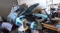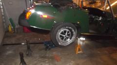 all the way to the limit, we got the hand brake to work well at half travel of the lever. Then a standard brake bleeding process all around to get the driving brakes to work properly, no problem there. Clutch bleeding turned problematic with trapped air in the circuit. On another executive decision that problem will wait for another day, as the family was waiting for dinner. Duck tape on the tire is part of the process of repainting the ROstyle wheels.