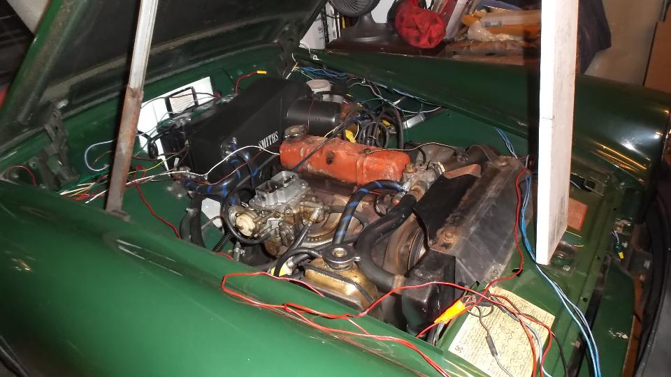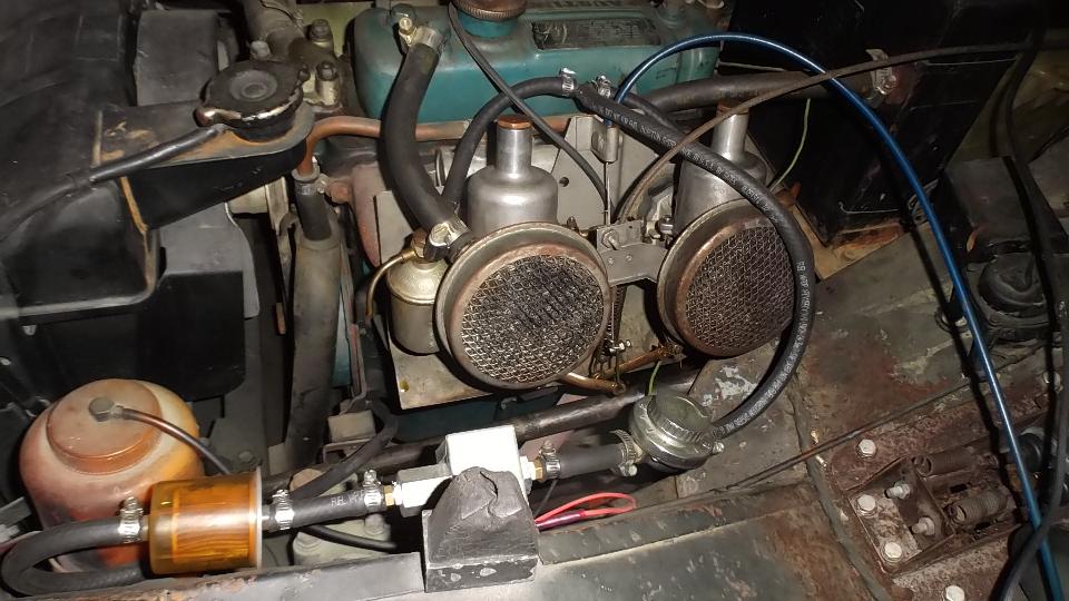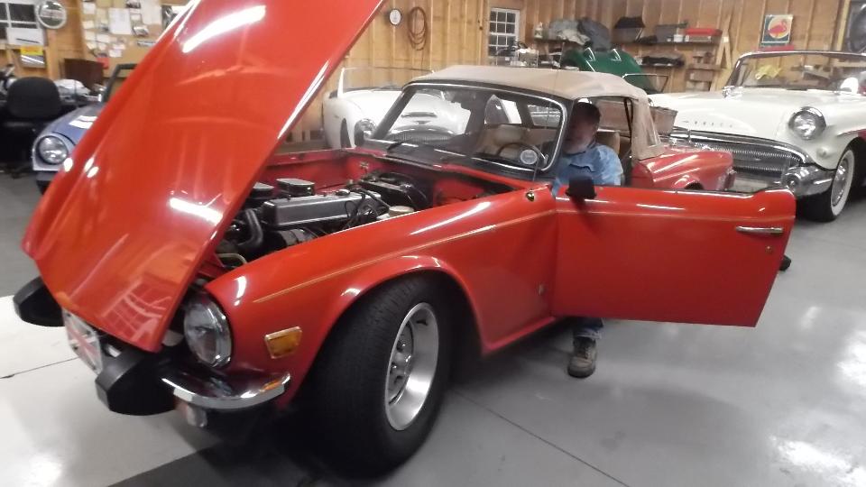 Next up was the TR6, reported to have too fast idle. Find two non-stock Weber downdraft carburetors. It started easy enough, idling fast as noted. Upon reducing idle speed it was running rough and would backfire through one of the carbs on quick acceleration.
