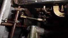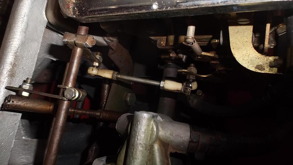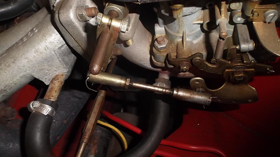 Air cleaners off and a manual stab at the throttle reveals the accelerator pumps are working (at least a little). Seems like one carb too rich and one carb too lean. Another issue is throttle pushrods being too short, so full throttle forces the linkage over dead center where it will catch and not return. Someone had rigged a mechanical stop on the pedal arm to prevent the over center problem, but that results in the secondary throttle plates opening less than half way (no good for performance). While fiddling with it a brittle old nylon rod end broke leaving one carb with no motion. I could still give it a tune up by pushing two throttles by hand, but the car will not be drivable like that. Put on the order list longer pushrods, at least one link ball end connector, and note to remove the throttle stop.