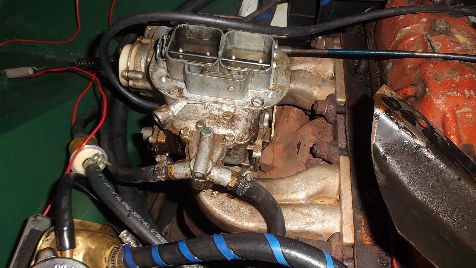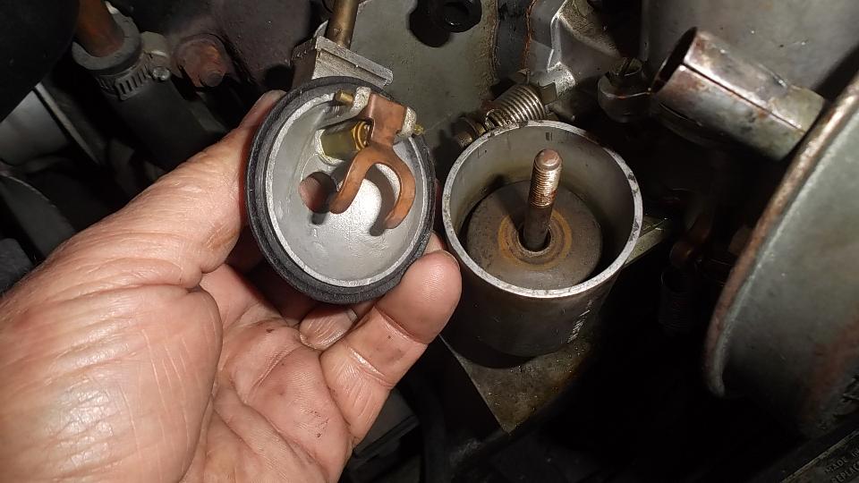 Then trying to crank start it would pop back through the carburetor occasionally, otherwise not run. This turned out to be distributor drive gear mis-oriented with rotor pointing in wrong direction. A 30 second session of musical chairs with HT wires in the distributor cap got spark timing close enough for the engine to start and run, which it did for the first time since purchase of the car several months ago. No doubt the mis-oriented HT wires will confuse the next mechanic, but we might fix the drive gear later. We also adjusted the electric heating release automatic choke so it would release the choke after warm-up.
