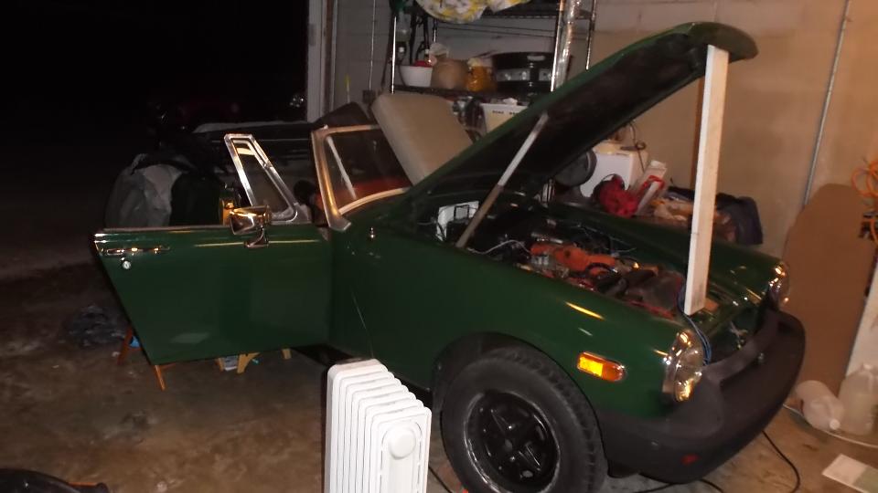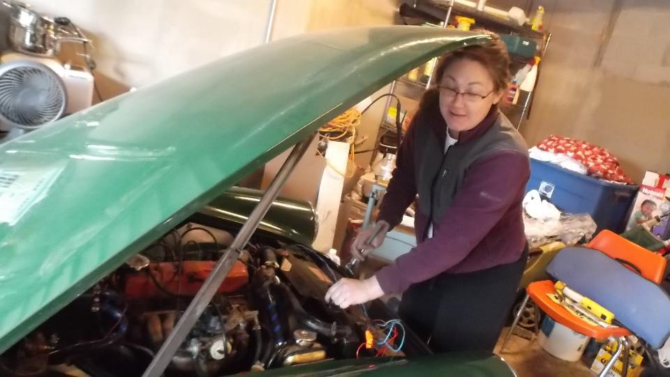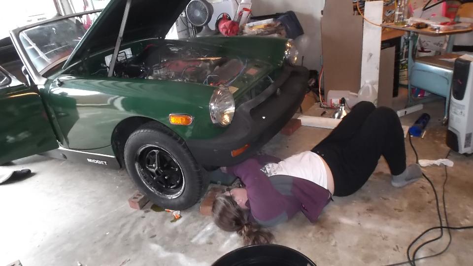 First of all, some slightly more complimentary pictures of Elizabeth working on her MG Midget. She is a quick study and likes to get into it. Here she is pulling the leaky radiator so it could go to the shop for repairs.