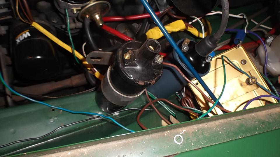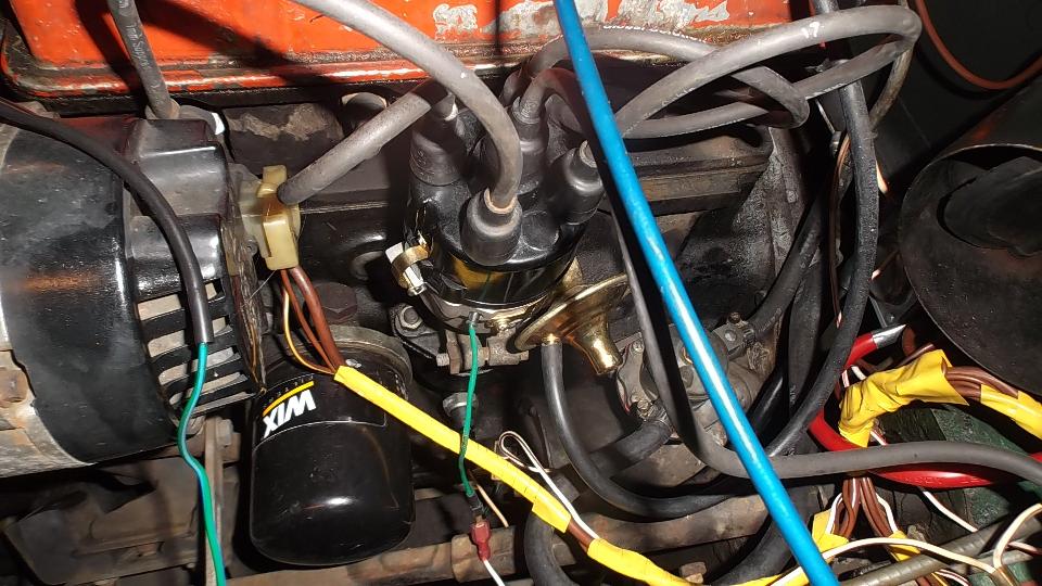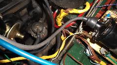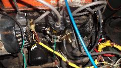 The car has a Weber downdraft carburetor (not a bad mod), points an condenser type distributor (also not a bad mod), and wiring is somewhat disheveled (too many non-standard wires). After a few electrical tests we set the new 1.6-ohm ignition coil aside and reinstalled the old 1.6-ohm coil (nothing wrong with it). What was supposed to be a 1.6-ohm ballast resistor turned out to be 10-ohms, so we tossed that out and installed a length of resistor wire with the correct 1.6-ohm resistance (ballast resistor for the 1.6-ohm coil). After connecting another wire from coil to distributor, we had spark. But no fuel flow.