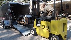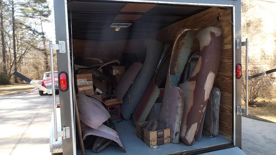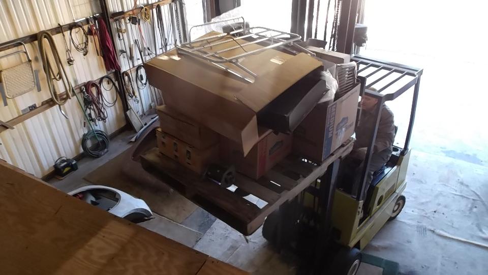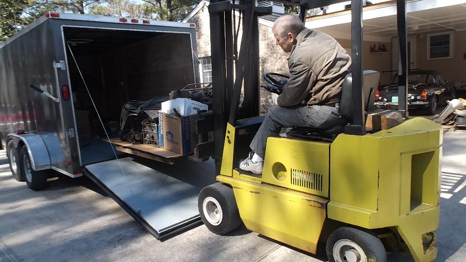 The seller was running the fork lift to help with moving and loading. We took all of the boxes and loose parts in the big trailer. Two rolling chassis, three engines and some gearboxes will require another trip (or two).