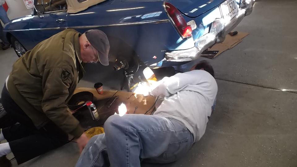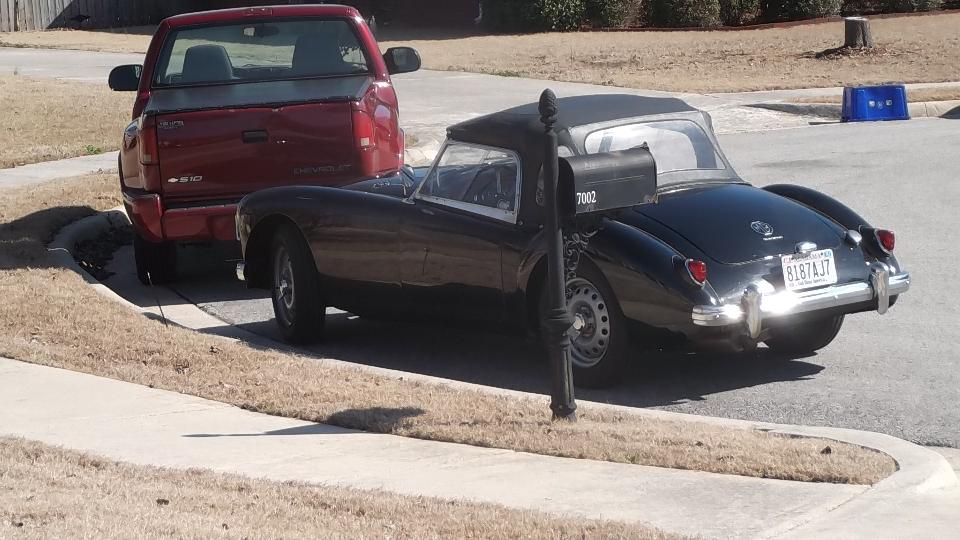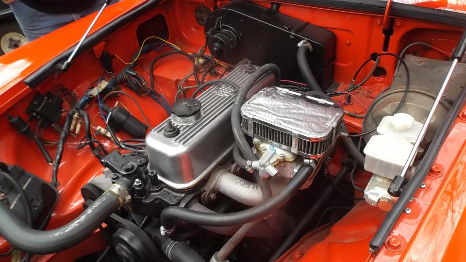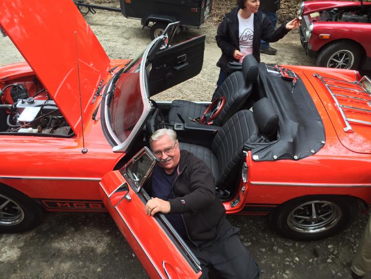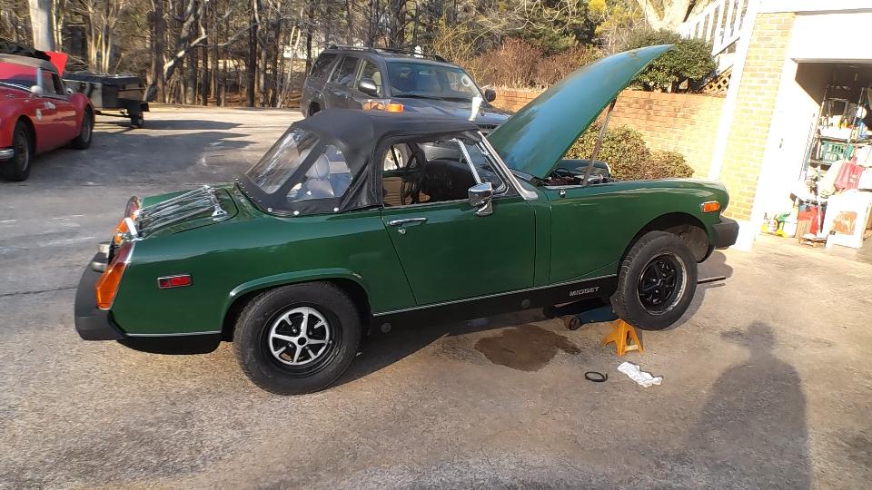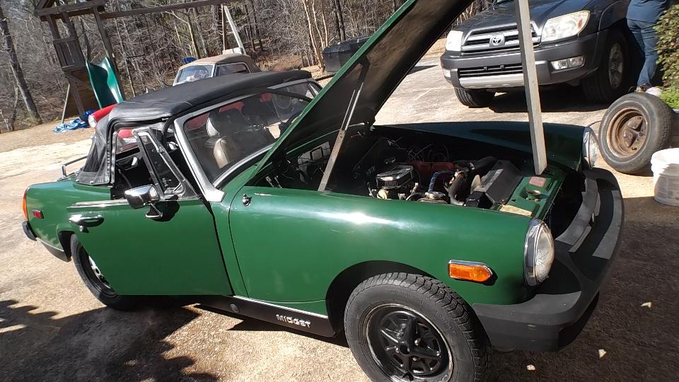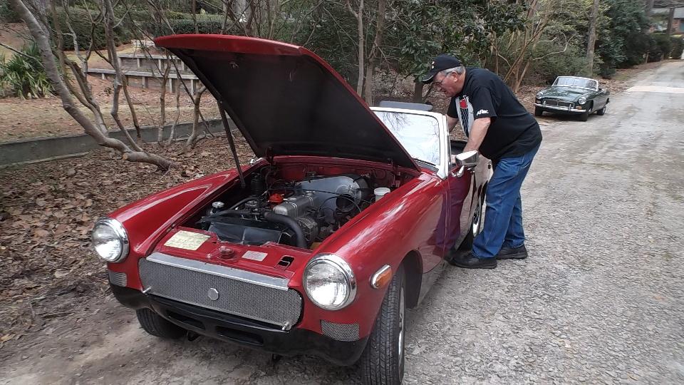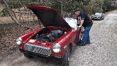 The MG Midget (1978 I believe) belongs to Beau Perry (wrong guy in the picture). It has a rather loud intermittent knocking or chattering noise. First thought was a bad alternator, but I think it has a bad fan clutch with badly worn bearing (wobbly fan blade), so it chatters occasionally. Easy enough part to replace, but not immediately in hand so put it on the next parts order.