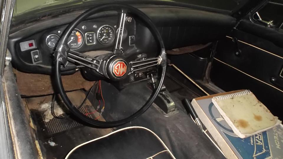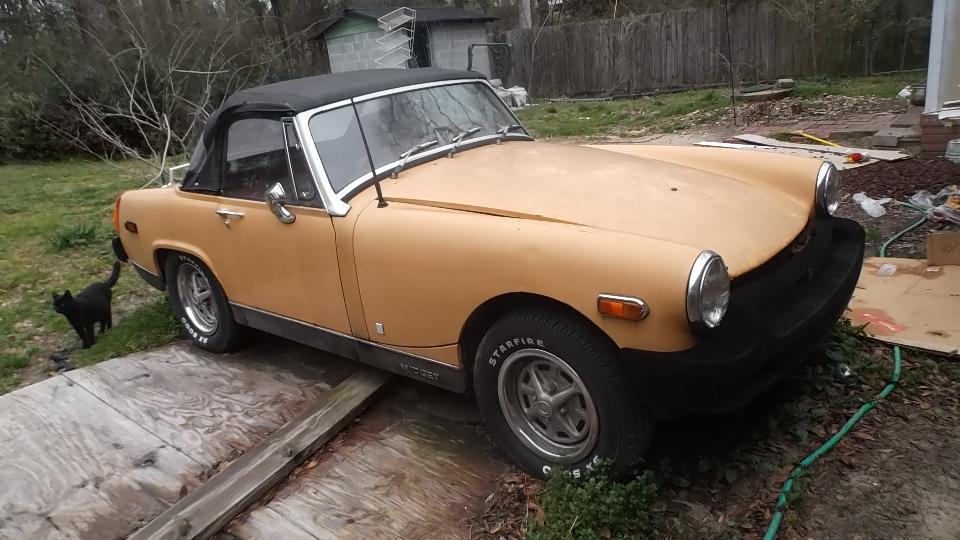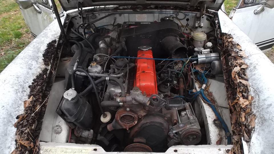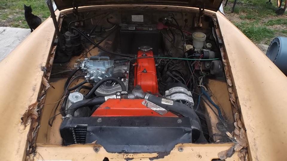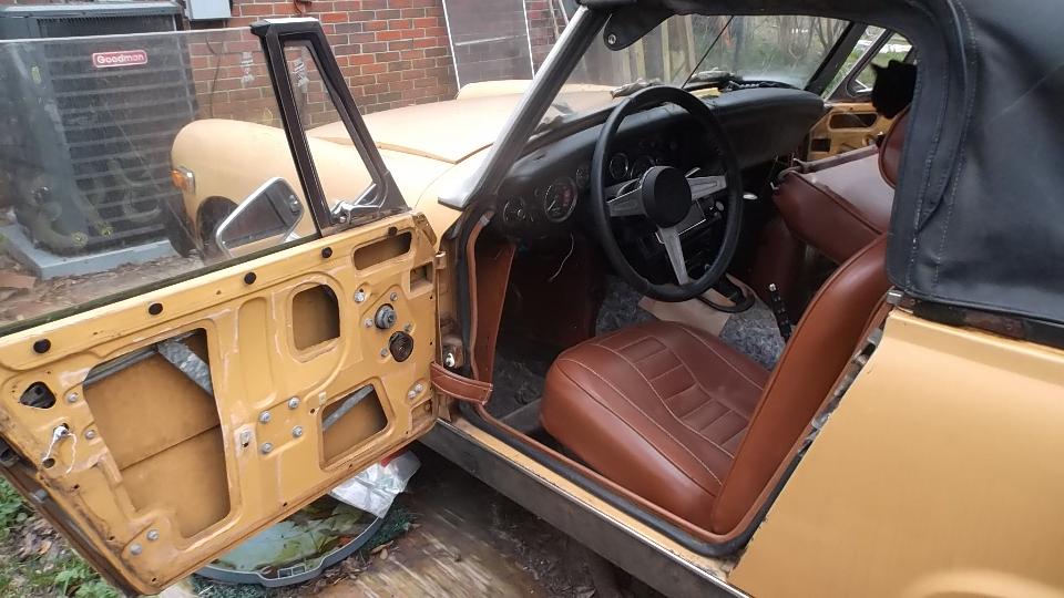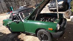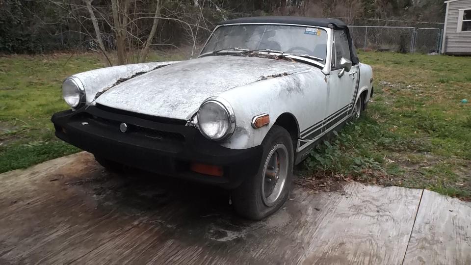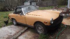 The brown one had a new Weber carburetor, supposedly ran but quit running and was parked, and carpet was out. The white one had a slightly bent LF fender and a bad engine with oil pan off (for a few years I suppose). The junk on top is mostly leaves,not rust. Aside from being dirty, the bodies are solid, not rusted, and paint may be serviceable when cleaned up. Looks like a lot of work there, and rubber bumper Midgets are not worth much (especially non-running ones). I took a bunch of pictures and fired off a report.