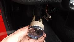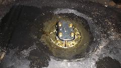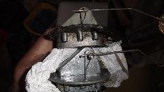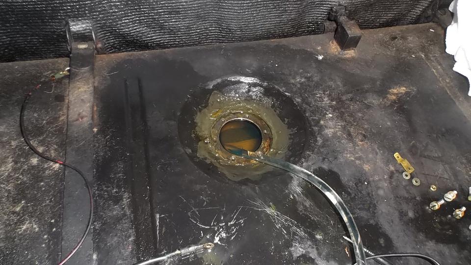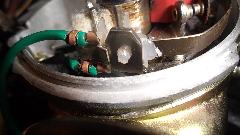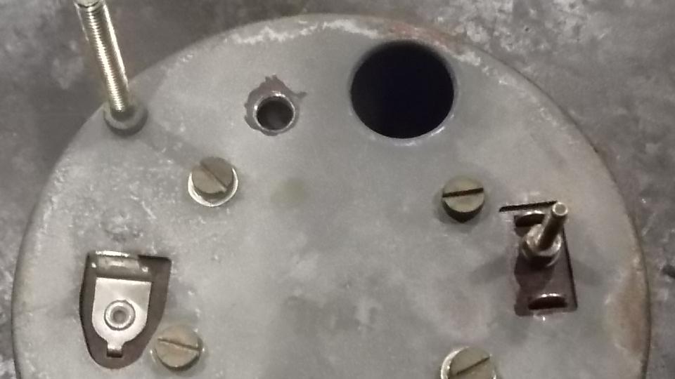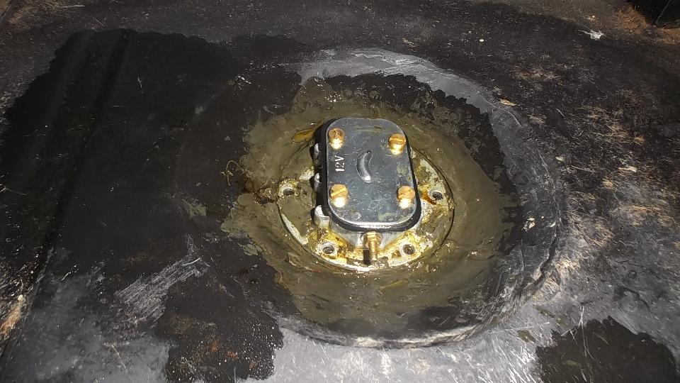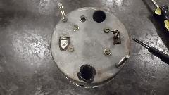 Shorting the gauge "T" terminal to ground drove the gauge to "E". Disconnecting the "T" wire drove the gauge hard against the "F" peg. So apparently the gauge was working. Reconnect the gauge wire, go to the boot, disconnect the signal wire from the sender unit, and the gauge goes hard to a"F". Ground the signal wire, and the gauge goes to "E". So far so good. Resistance in the sender unit should go from 0-ohms empty to something like 70 ohms full. This tank was full (fuel leaking out around the sender gasket on top), but sender resistance was about 1-ohm. Time to remove the faulty sender unit for inspection.