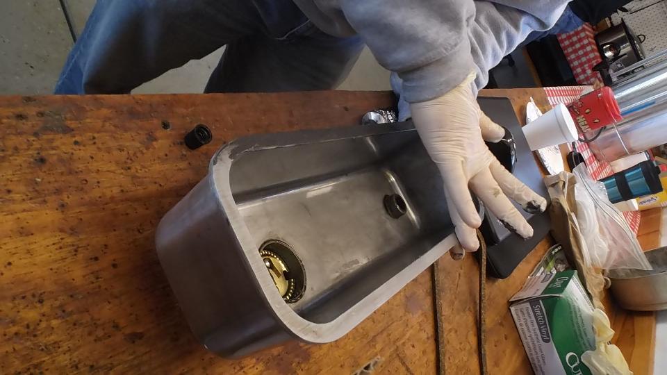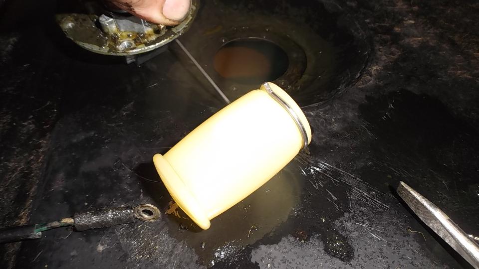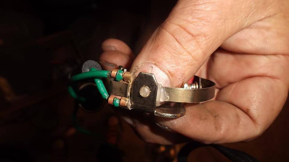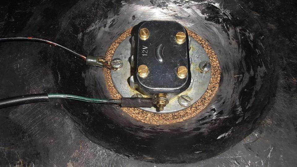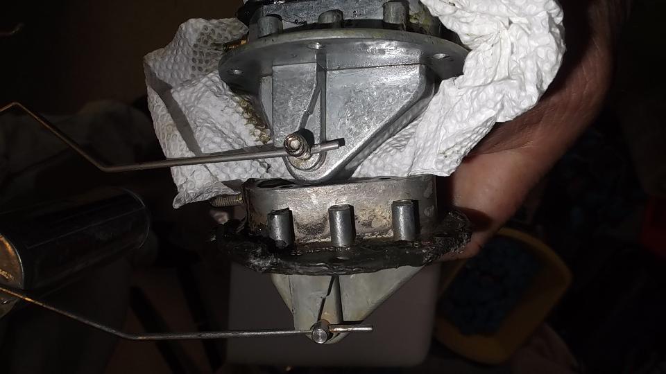 Did I ever tell you I hate plastic floats? We conjured up the idea of transferring the nice metal float from the old sender to the new sender. The old arm was staked in place, while the new arm was secured with a screw. A bit of tapping removed the pressed wire from the old unit. Trying to attach the old arm to the new sender, the screw thread stripped. Another bummer. JB Weld came to the rescue (don't leave home without it).