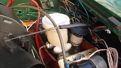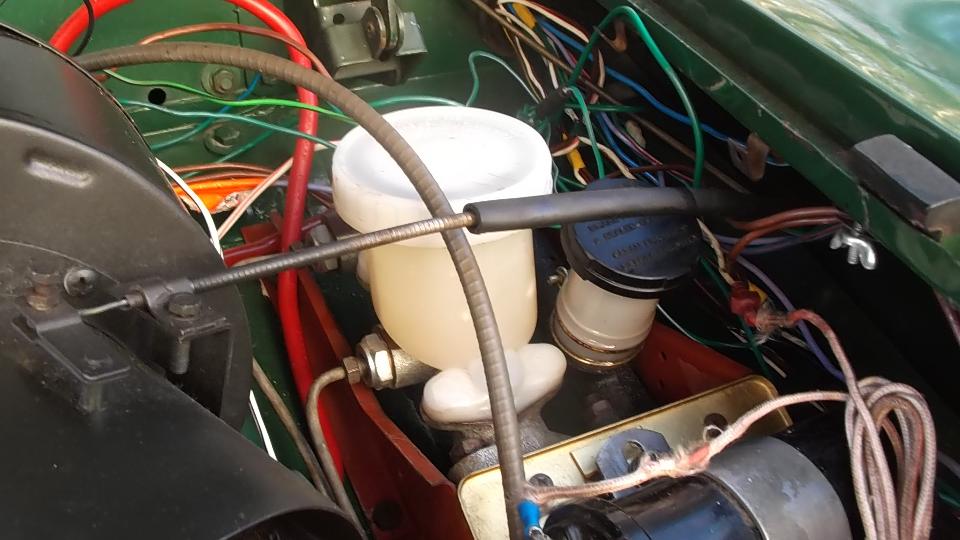 Late start today, mid afternoon, bound and determined to get the Midget clutch hydraulics working, last thing standing in the way of a test drive. Jack it up, put a small hose on the bleed nipple, use thumb as a check valve, pump repeatedly, stop to fill the reservoir a couple of times, and it's done. Fire it up! YEE-HAA.