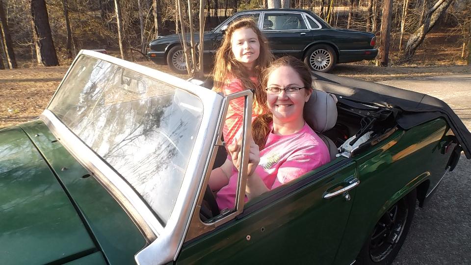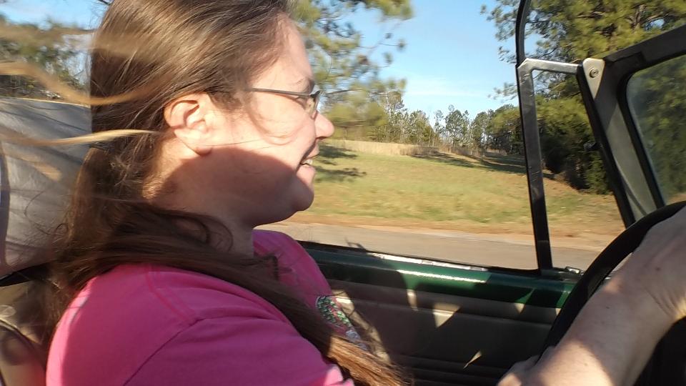 Engine runs, clutch works, synchros work as it runs through all the gears, and reverse works (once you figure out where it is). I recon the big grin tells the story best. I don't know how many years this car had been off the road, but it has been several months since Elizabeth drug it home.