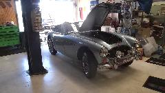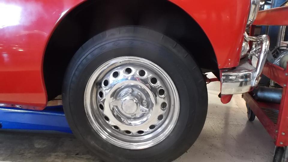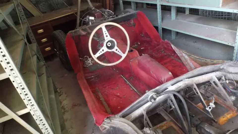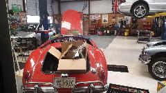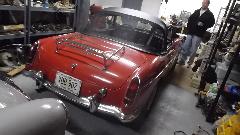 Oh my gosh, there's an MGA Twin Cam with chromed Dunlop pin drive wheels and period correct Arnolt front and rear Auto-Guards. It is here for a new wiring harness (among other things).