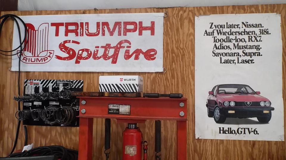 Go head and count the fuses, and they are not all in one place. --- Some of the memorabilia hanging around the walls. A hallway is lined with racing posters. It is a good place to have your vintage British car serviced (yes, Alfas too).