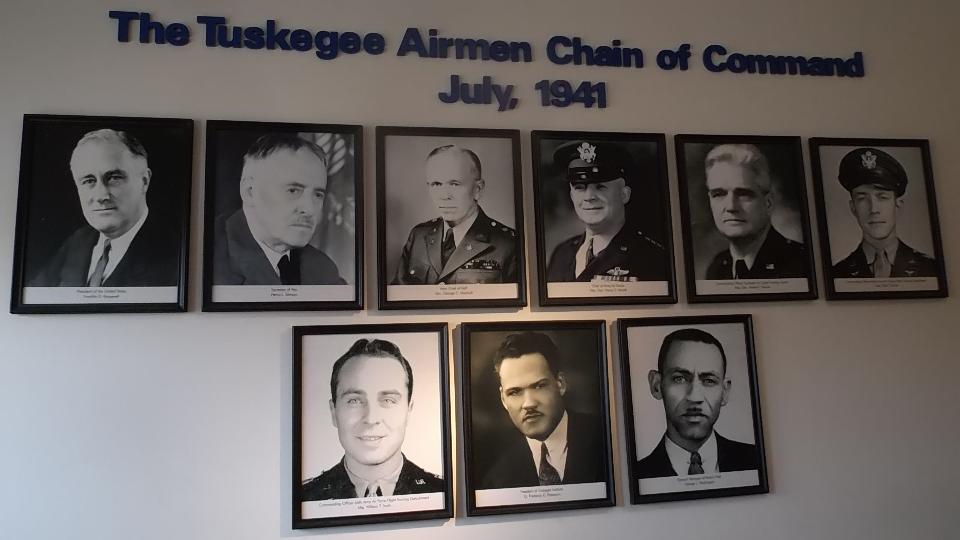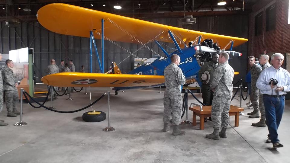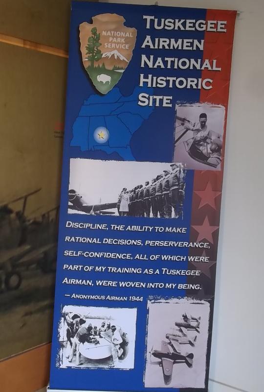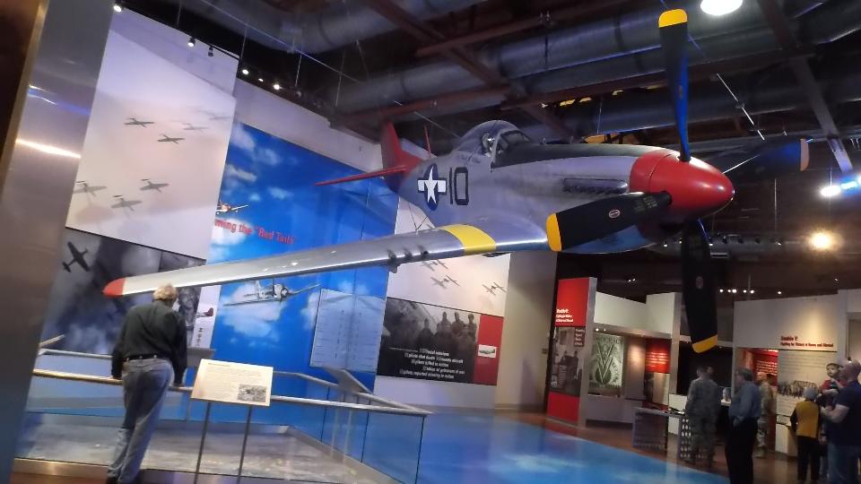 Today we collected a dozen cars from British Motoring Club of Montgomery Alabama. We met at Pikes Road (a town SE of Montgomery) and caravanned to Tuskegee to visit the Tuskegee Airmen Museum. This is a commemoration of the first squadron of black airmen who flew fighter planes during World War II, primarily as protective escort for bomber planes. It is an interesting place with two hangers containing half a dozen period fighter planes and lots of memorabilia of the era. There was a 30-minute video about the Tuskegee Airmen and their contribution to the war effort.