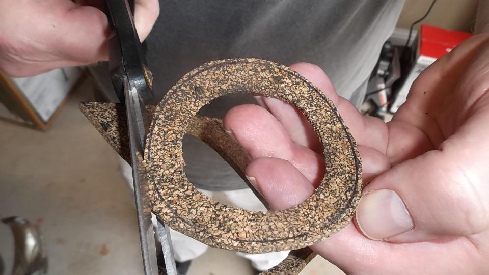 Siphon some fuel out of the tank to lower the level, not to wet the newly "glued" sender arm joint, and to allow cleaning and drying of the sealing surface. Trip to the parts store to buy some 1/8-inch cork gasket material, cut an oversize square, hold it over the opening in the tank, and use a pocket knife to carve the matching hole in the gasket. Mate cork to sender unit, and drill holes in the cork with 1/8-inch drill (nicely undersize to seal against the 3/16 diameter screws). Hold cork to sender again to trace a circle around it, and cut it out with scissors.