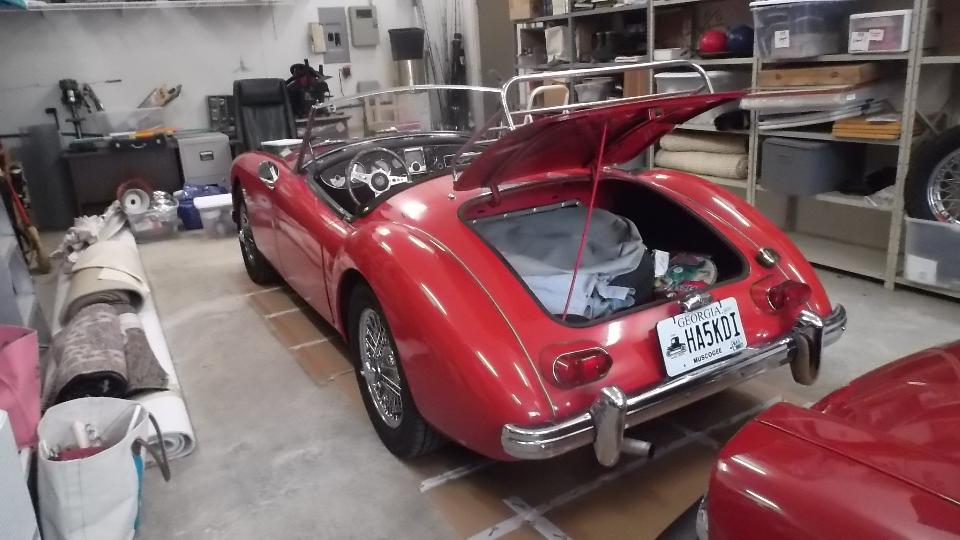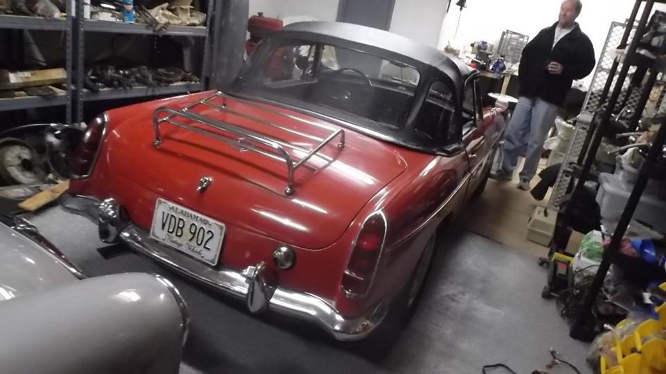 Then we had another appointment, and were off to follow a sport-ute to the home of David Shelly in Madison, AL. After pigging out on Pizza and some extended chat about enjoying cars and competition and clubs and web sites, we did a short tour of the garage to check out David's MGA 1600 and his 1964 pull handle MGB, each having its own rack of left over and spare parts. These are very nice restored cars, so I could only nit-pick a few details on originality, but I may get to tune up the MGA and adjust the choke later. Then while everyone else is turning in about midnight, I get to go to work to bring you these photos and notes.